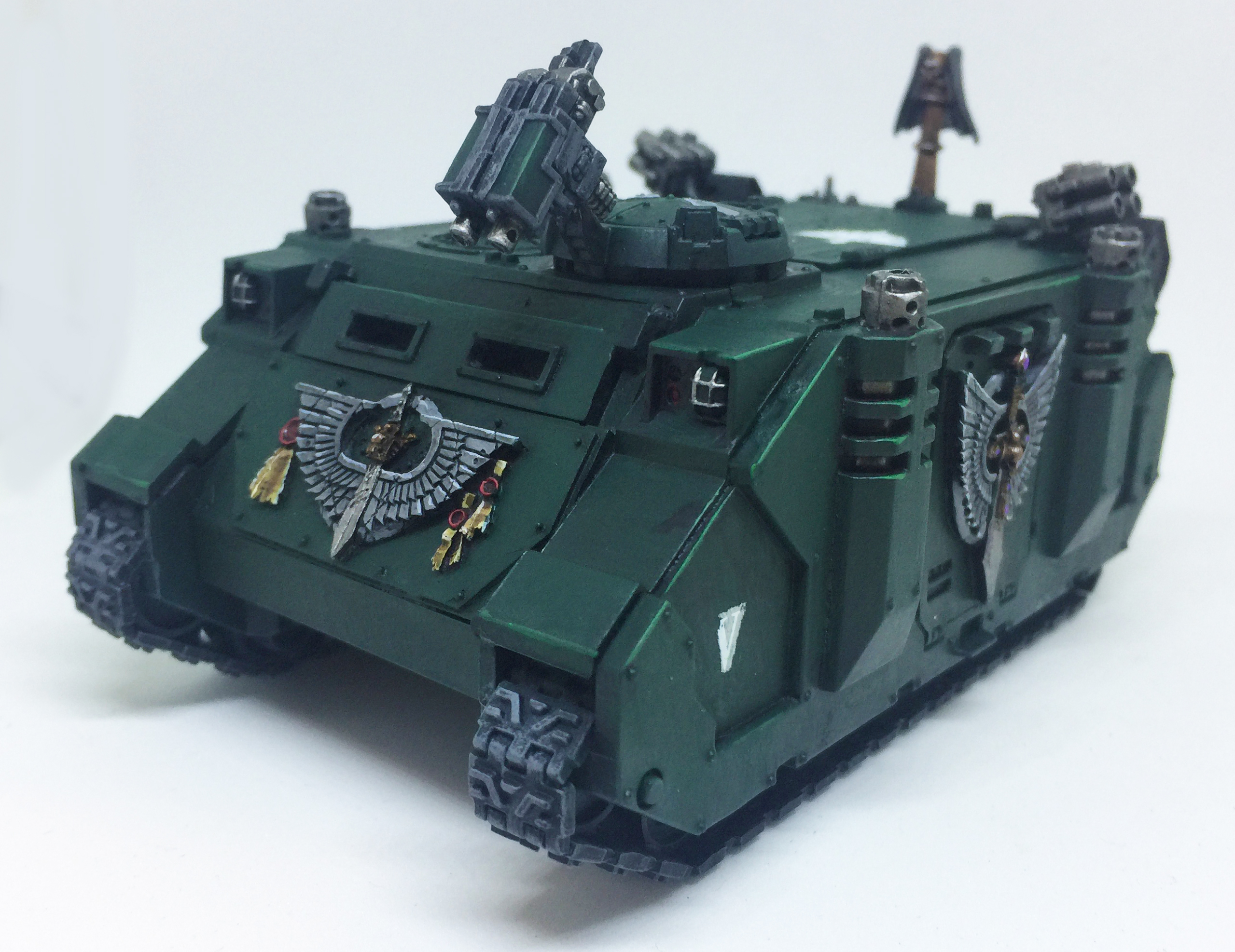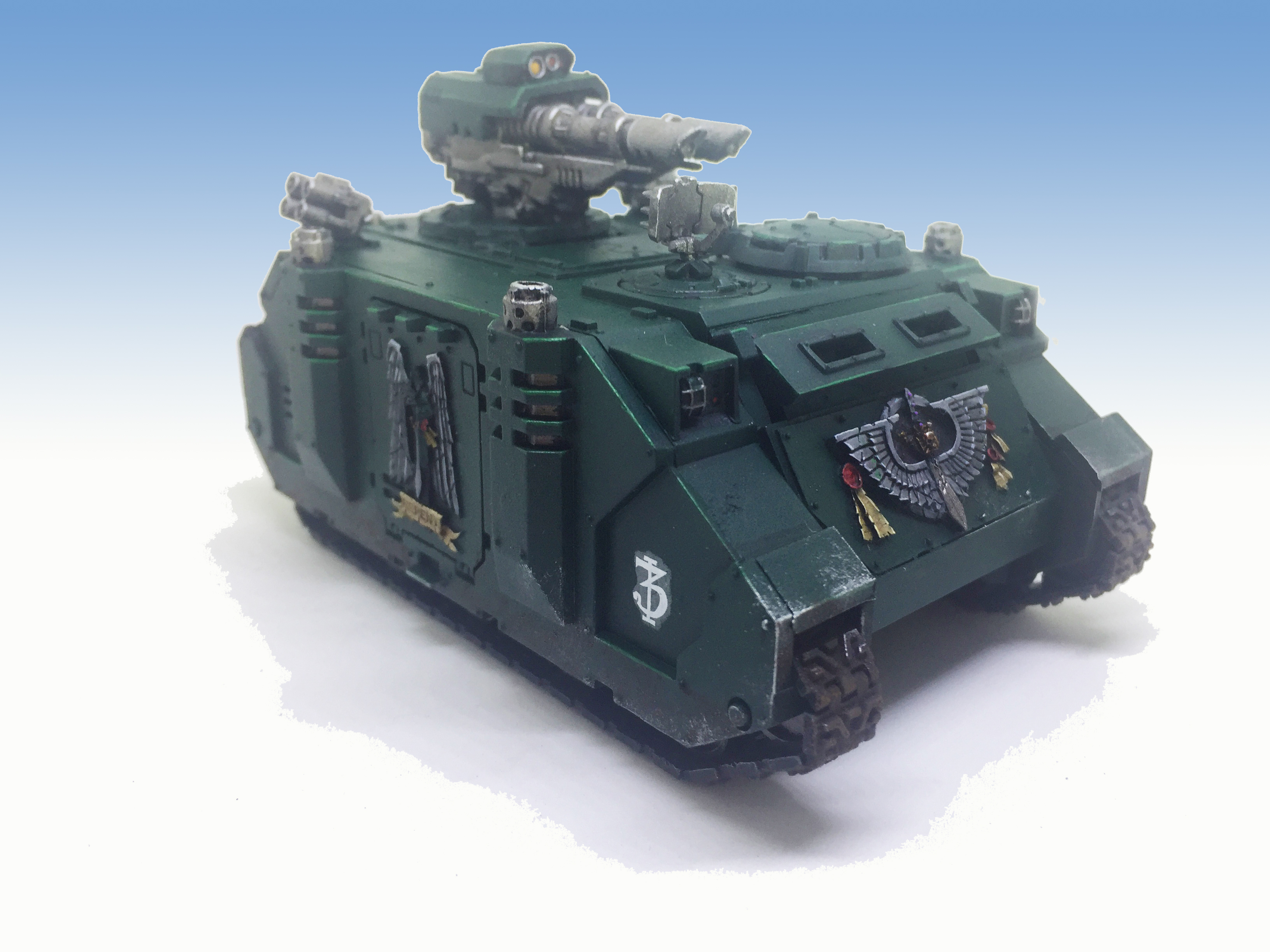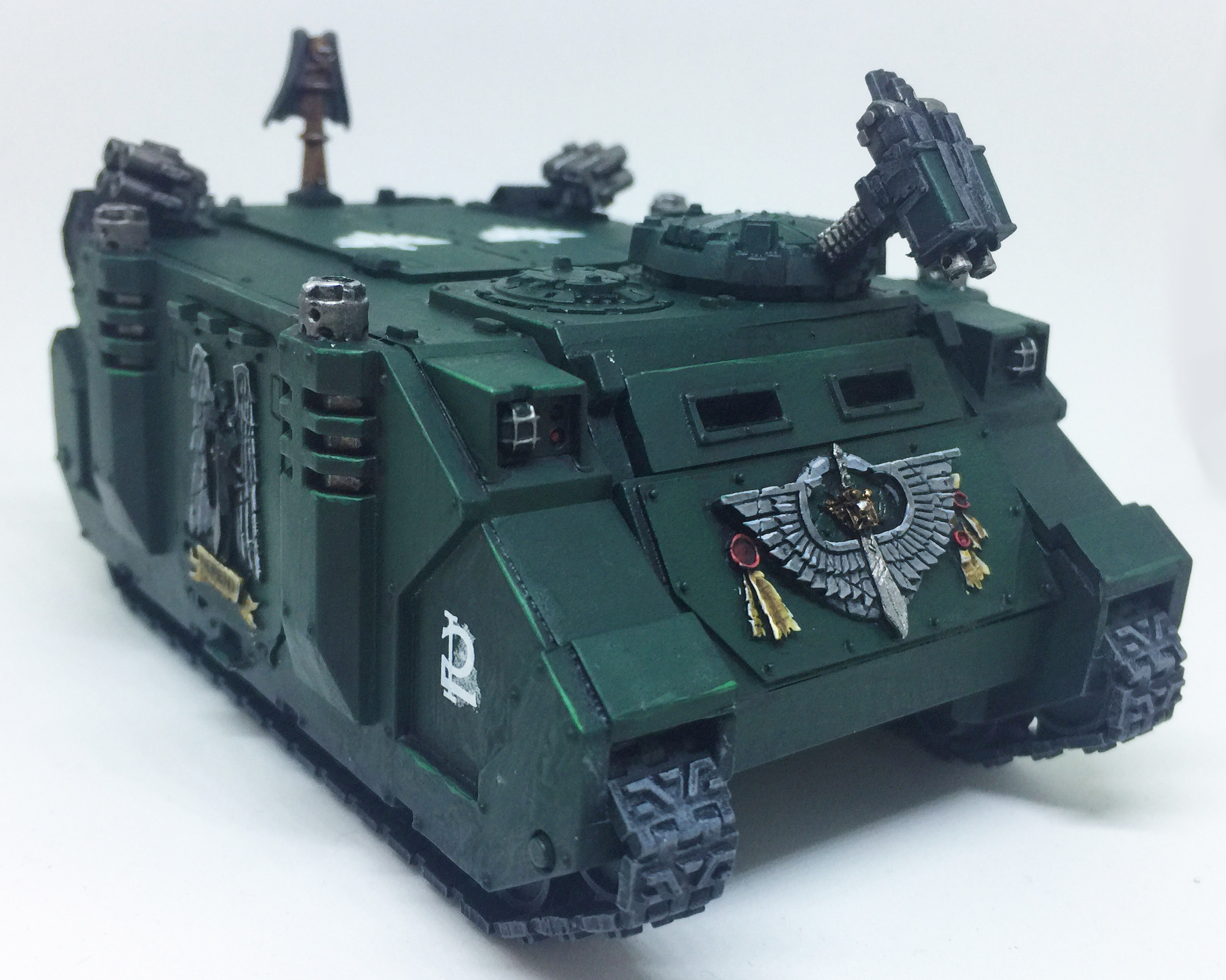 After saying my Divine Exorcists were finished, I decided the army would be radically improved by giving the marines some transportation, so here is the first of possibly two rhinos, painted to a basic standard.