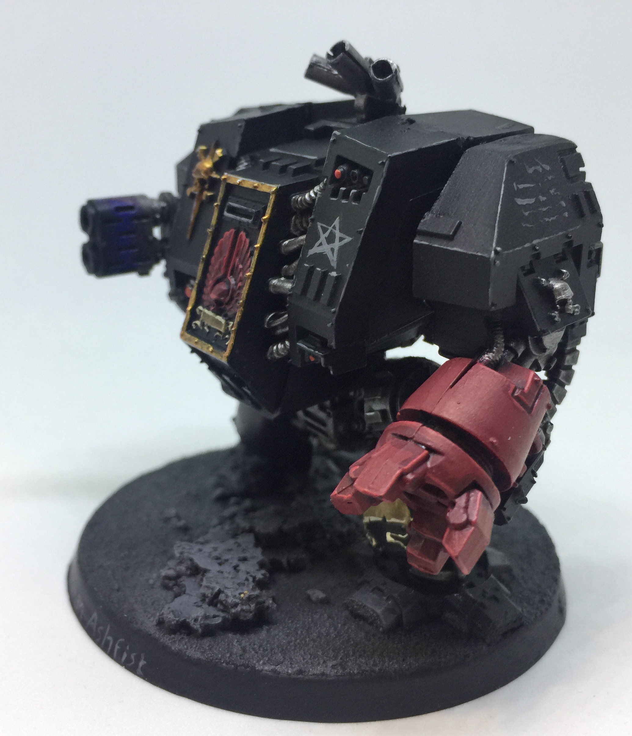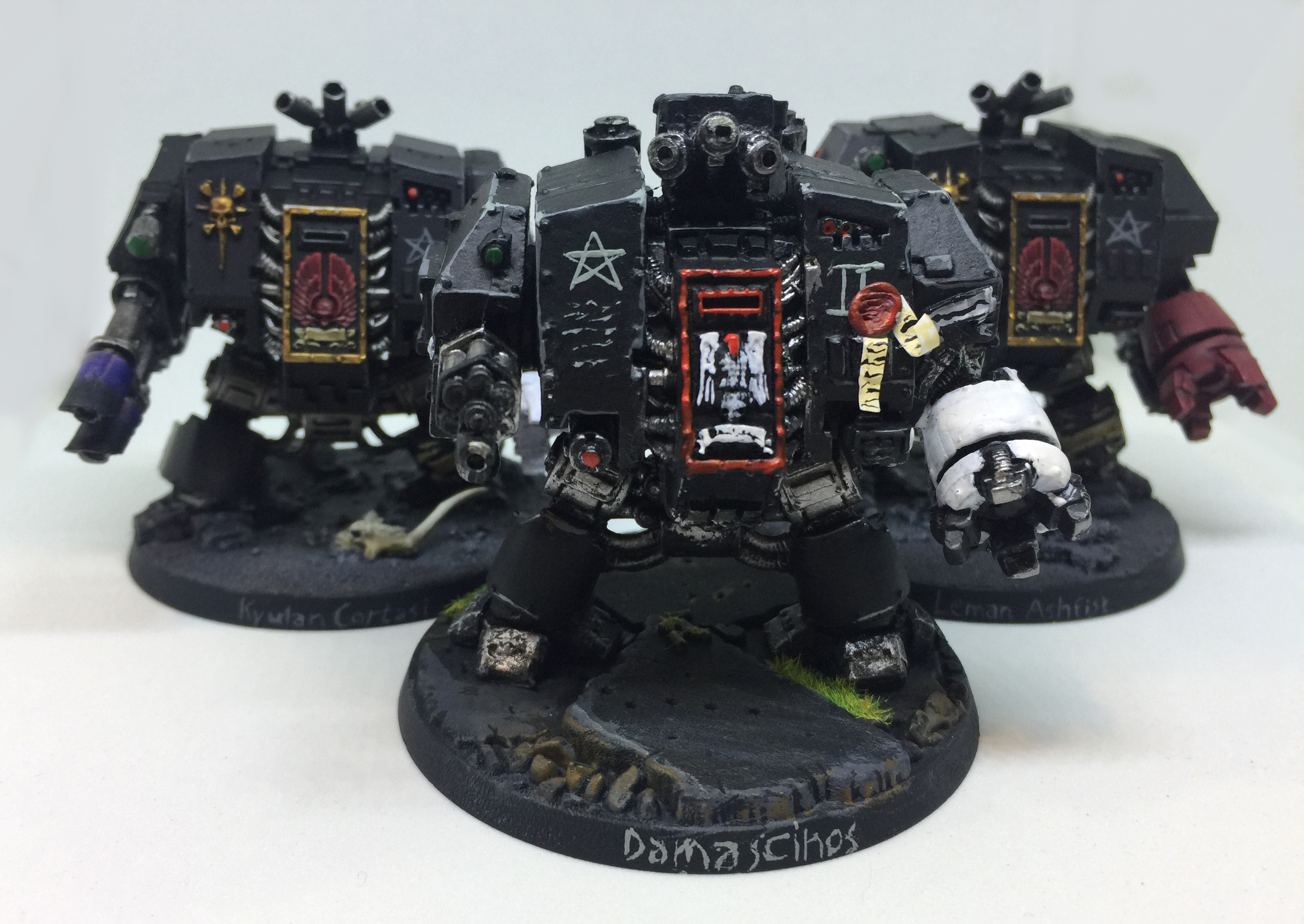 I love space marine dreadnoughts. I have always loved space marine dreadnoughts, so why did I have so few up until now? Who knows. Maybe it was fear of those fists. I decided to start remedying this problem by picking up a couple of Black Reach dreadnoughts and painting them up for the Divine Exorcists. I now have a trio of them when they are added to the existing dread, Damascinos.