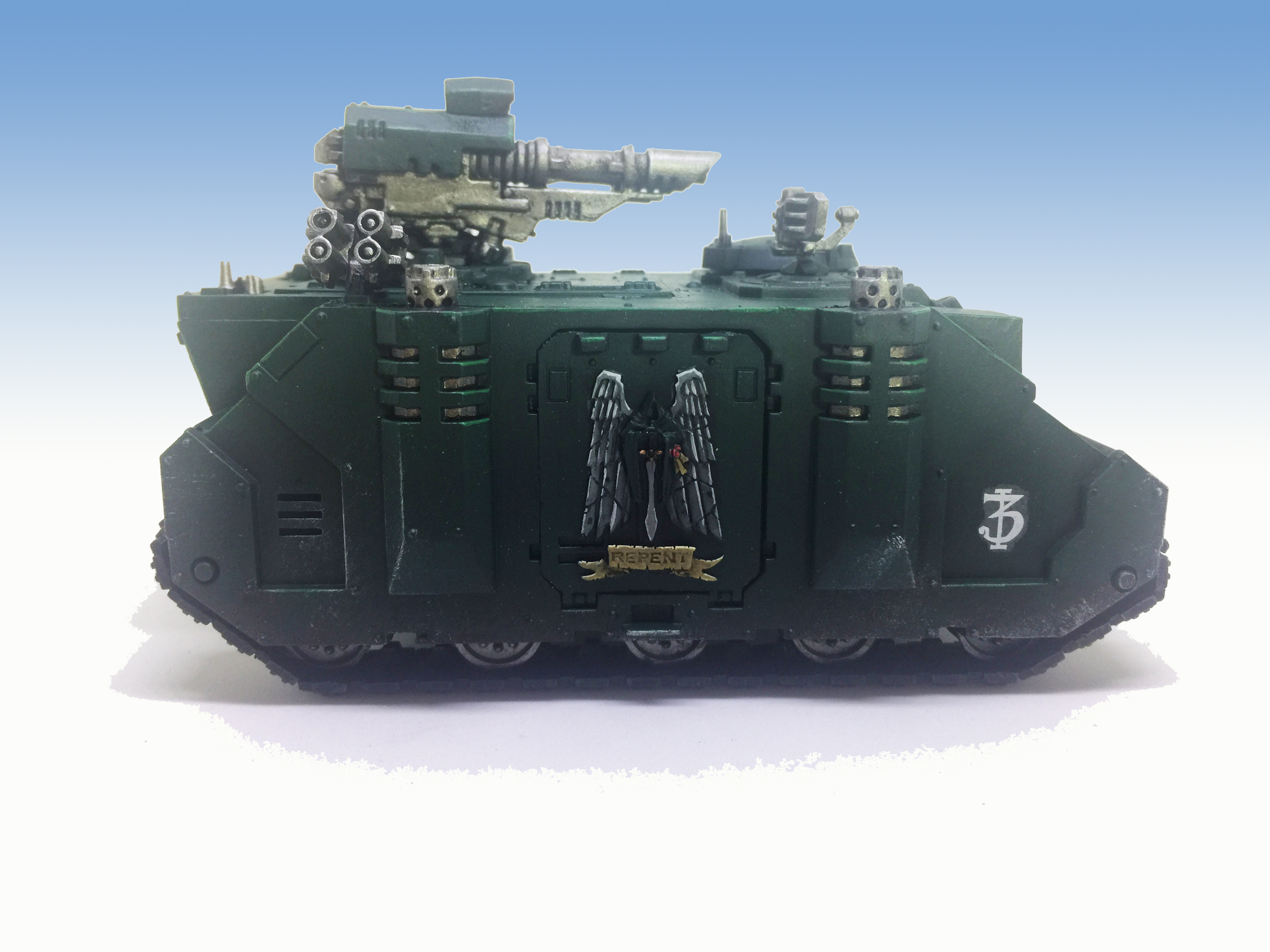 Today's first model is a Dark Angels Razorback. The rhino is brand new, but the turret is reclaimed from an old model. It's slightly wonky, but as my friend Martin said, space marines are tramping around the galaxy, getting into trouble, so it makes sense that some of their equipment might fall into disrepair.