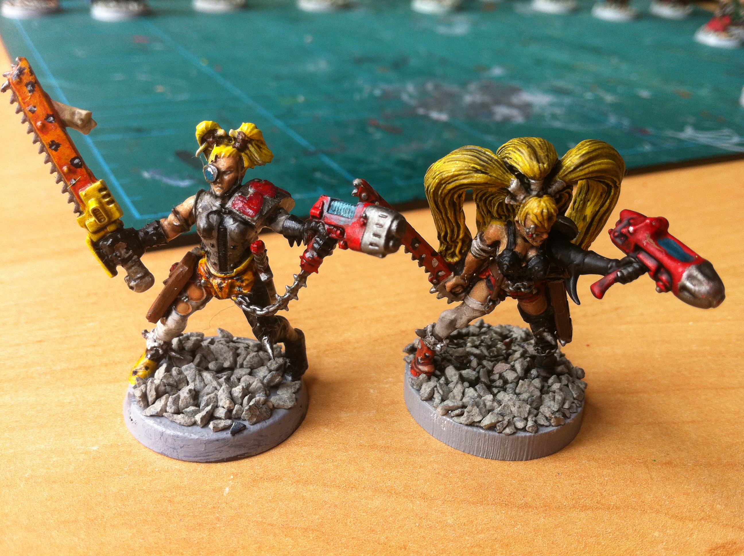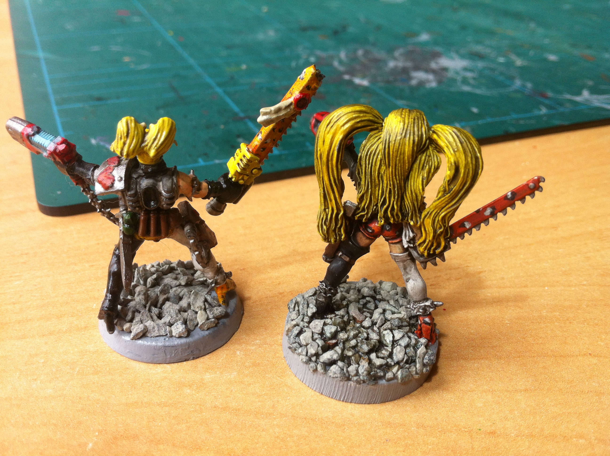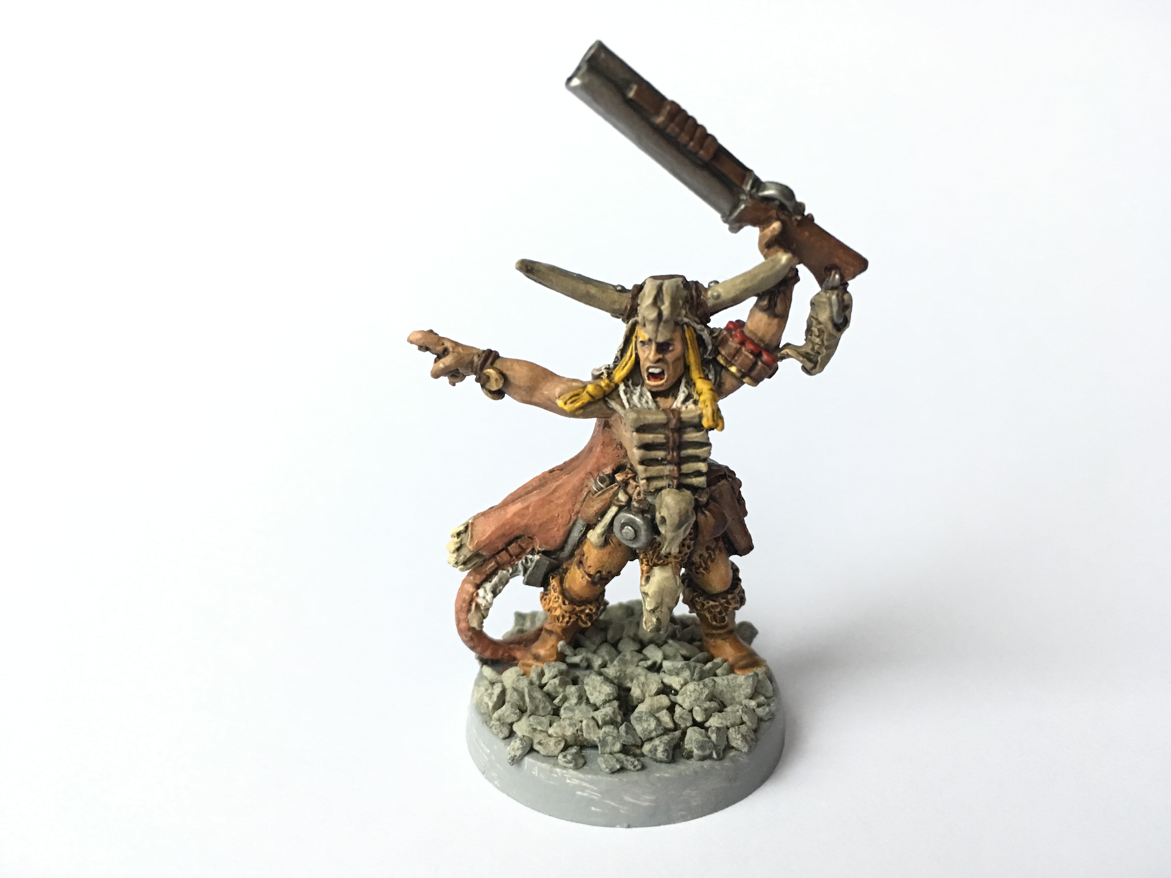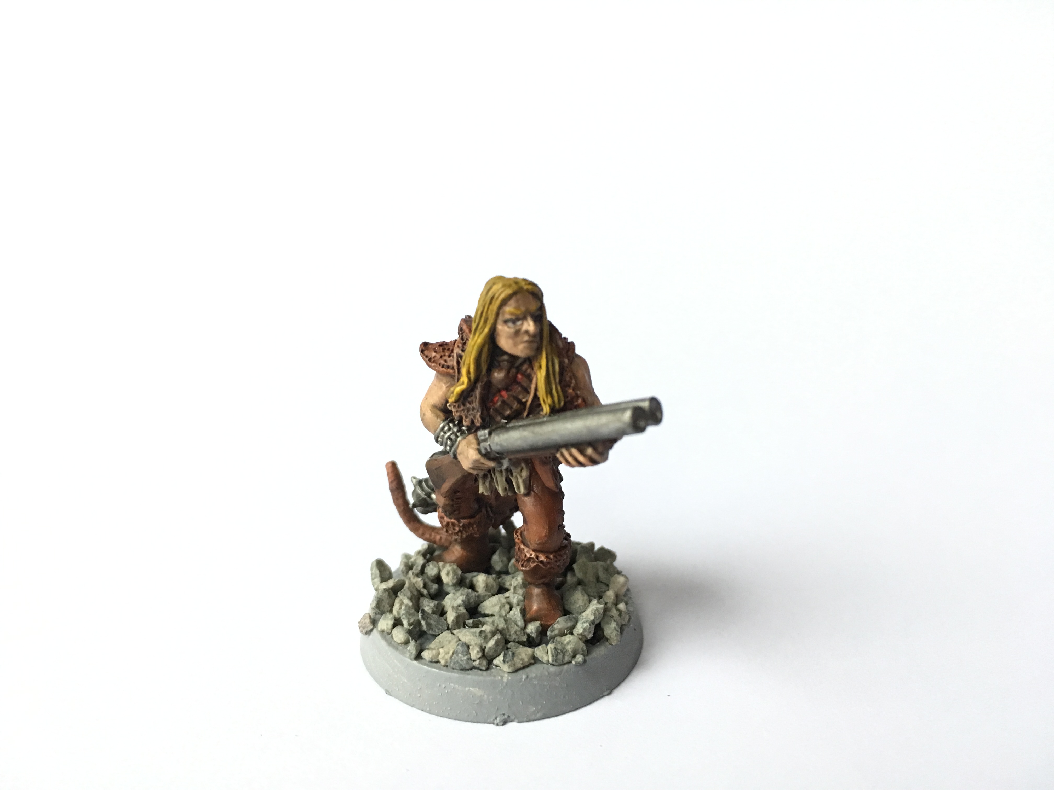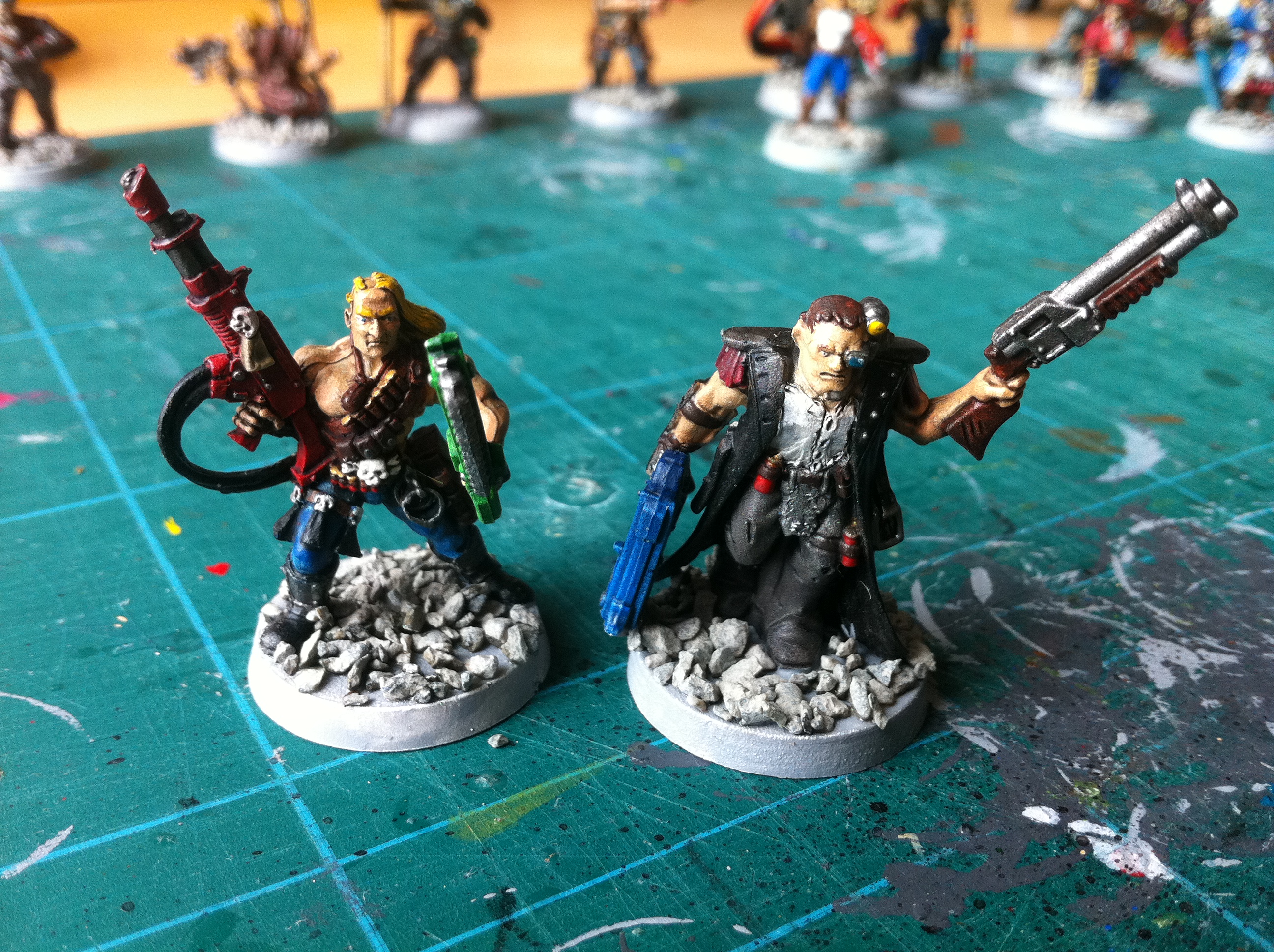 wanted to paint them in such a say that they looked like they had been living next to something that gives off radiation and caused all their hair to turn blonde and their eyes purple. Brakar has black hair due to the fact that he is not a proper ratskin, and is wearing jeans. note that the crouching ratskin with shotgun is also wearing jeans as he was my first model and is used a hired gun - ratskin scout and so comes into contact with other people from the hive.