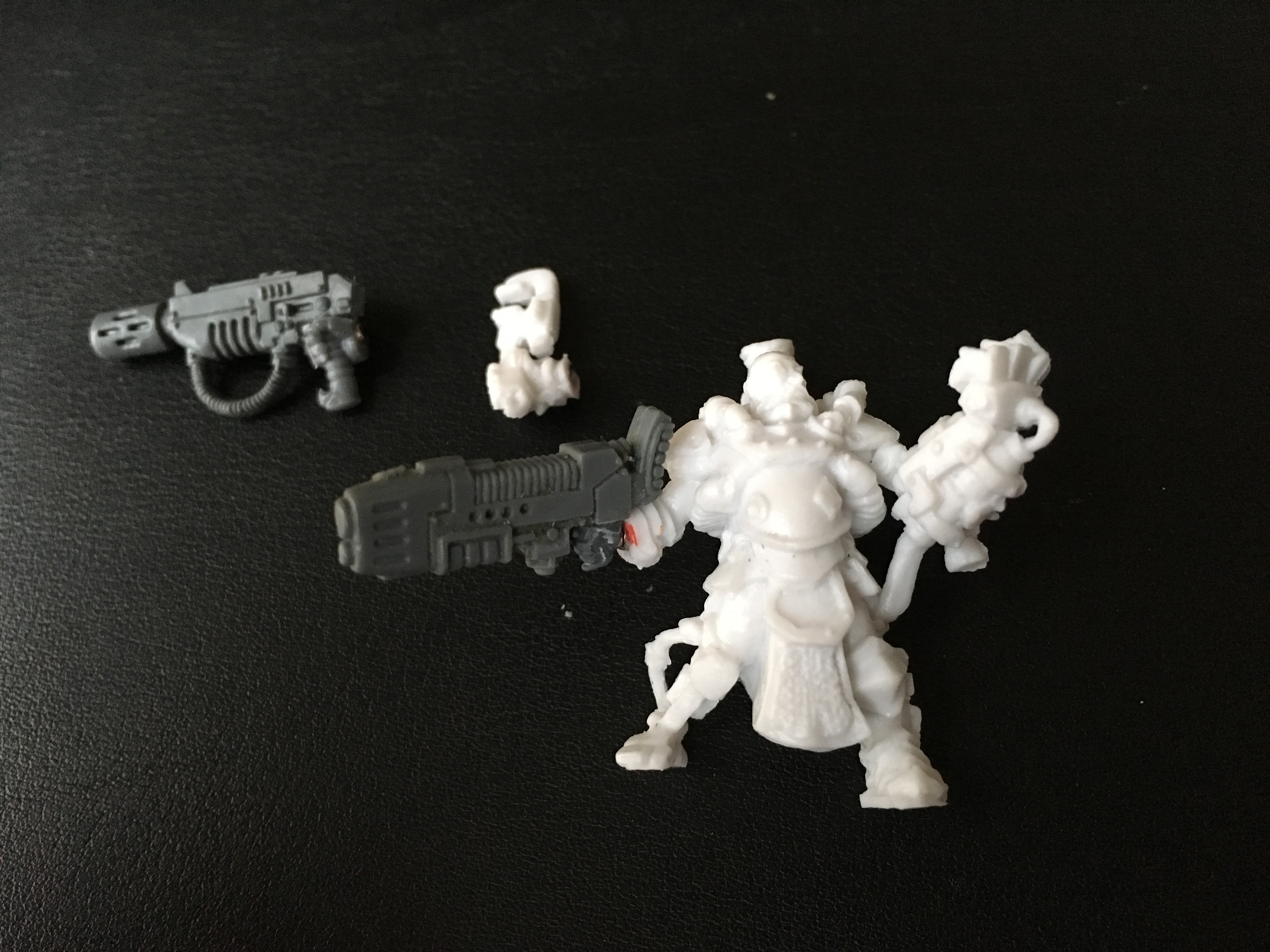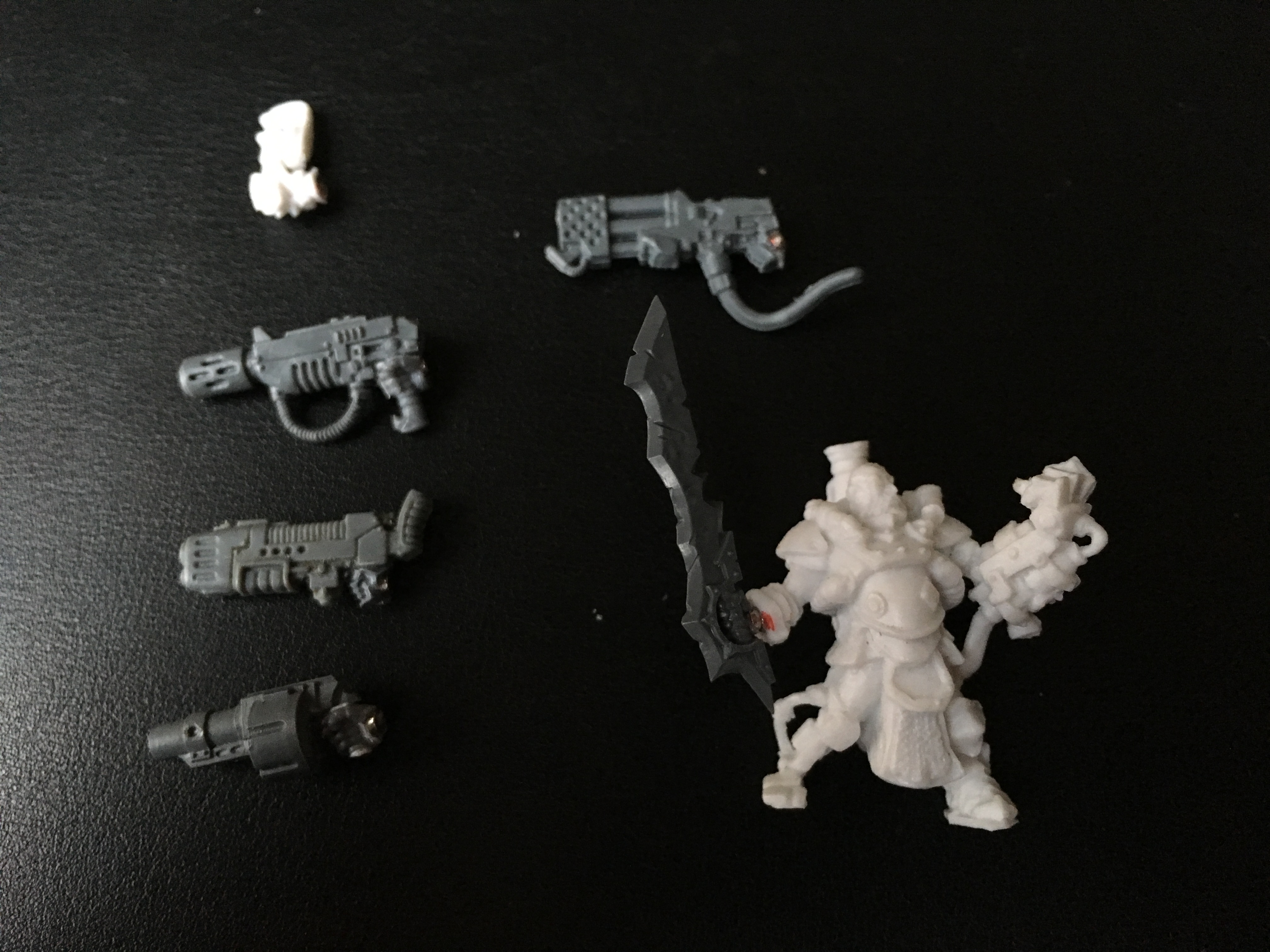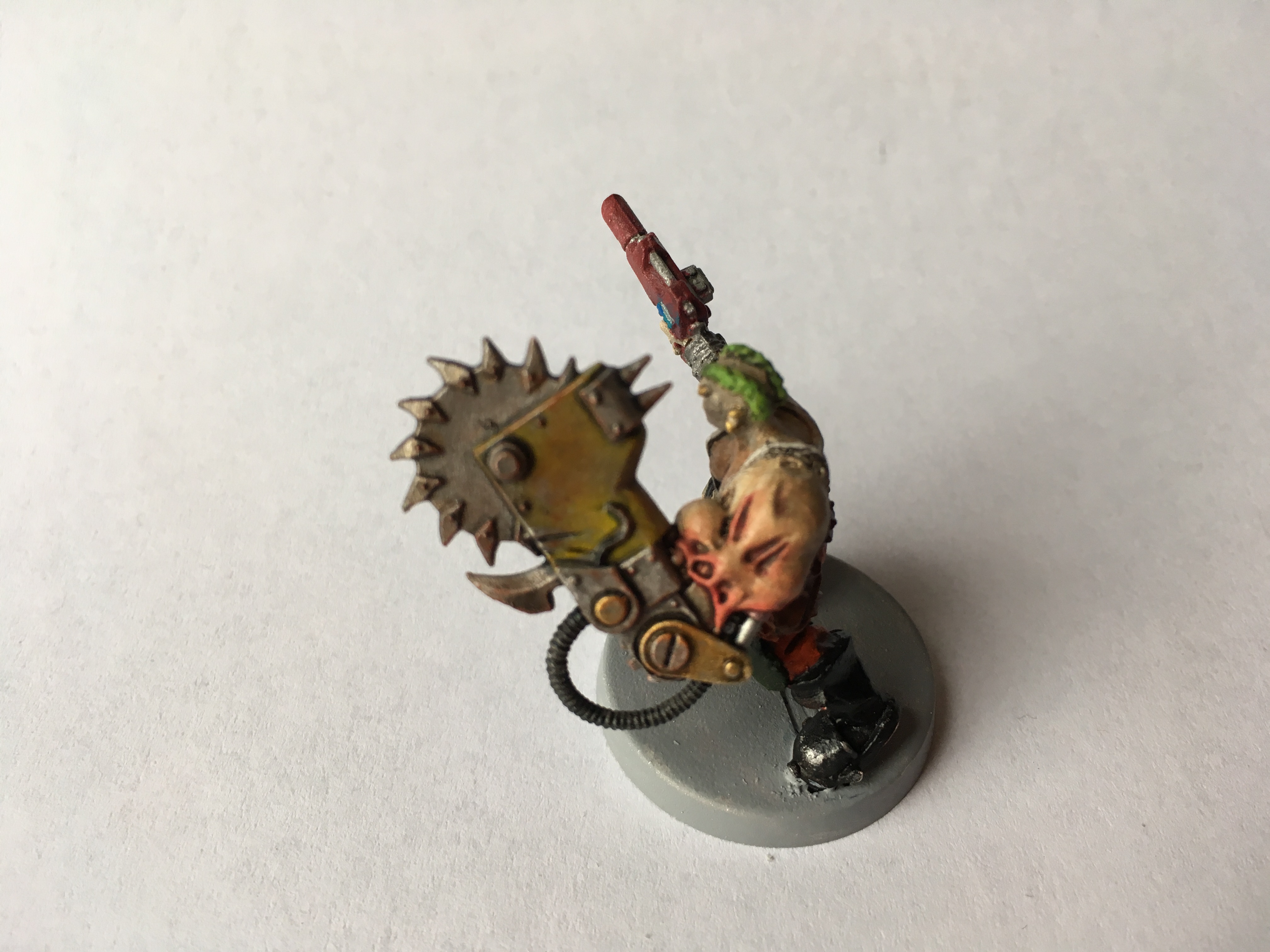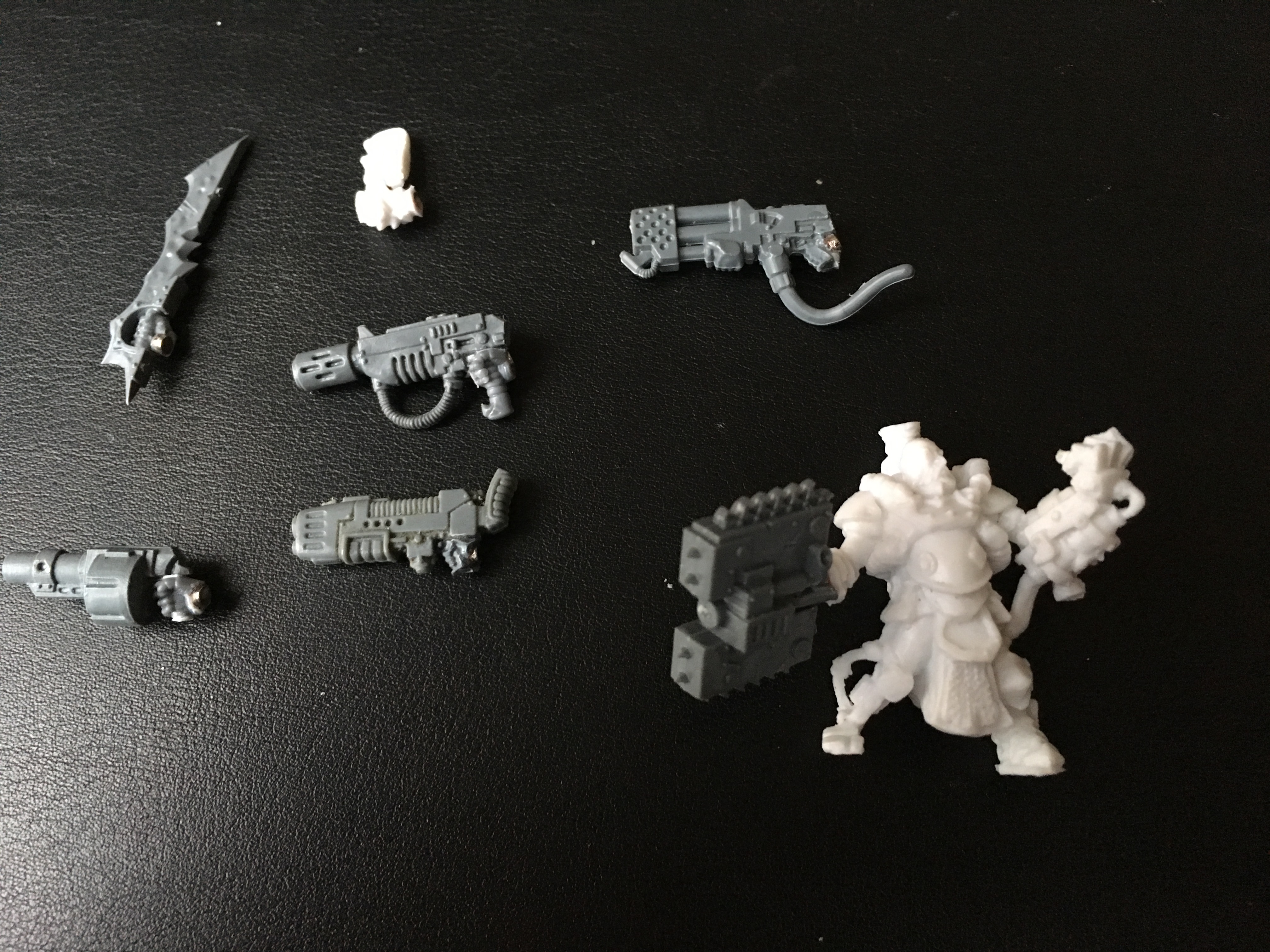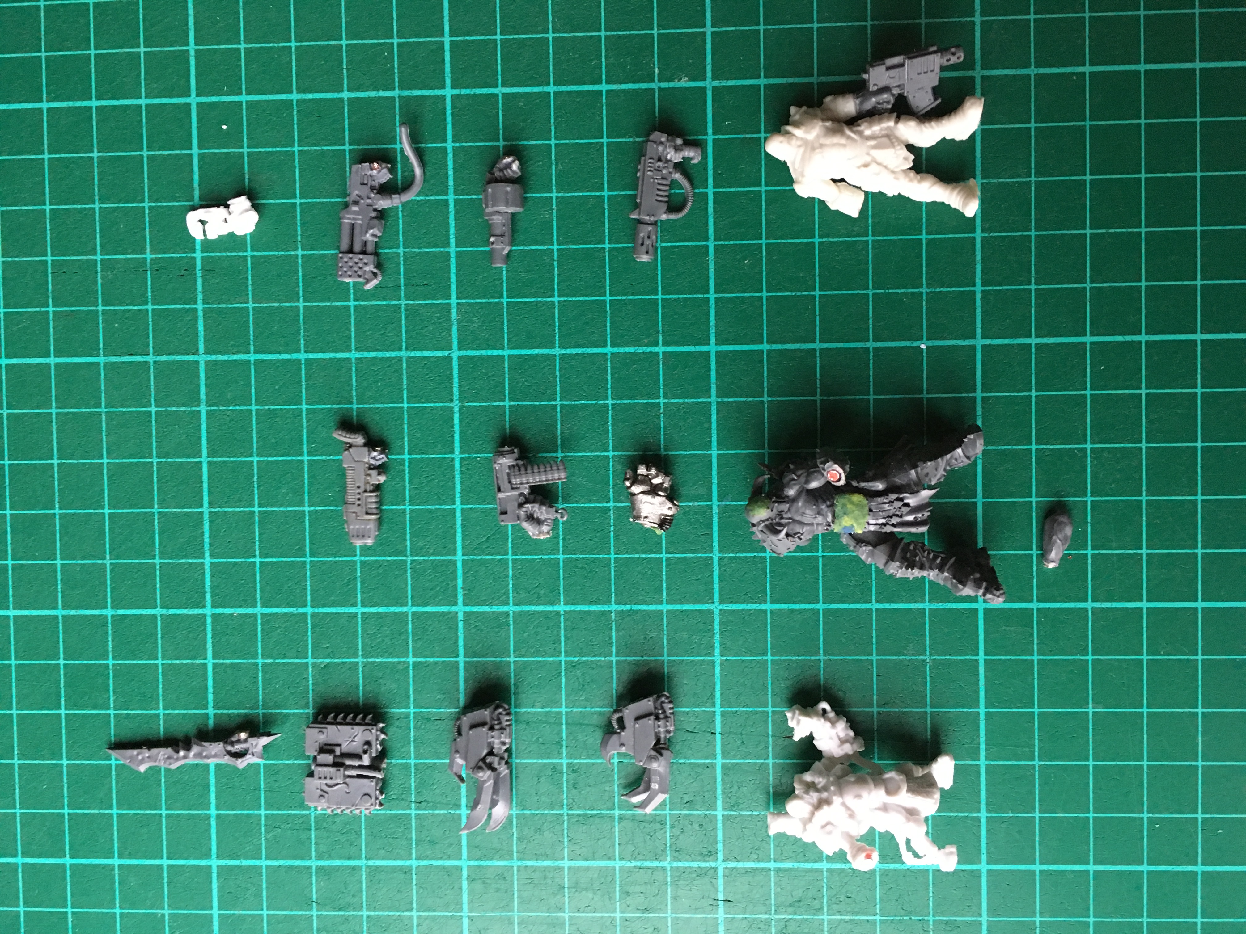 next comes the escaped pit fighters and their techno. all the parts are magnetised as I was feeling adventures us (read lazy and cheap as I didn't want to make lots of models armed with different things). the slaughter priest looked like a great model to play with and model - apart from its huge in comparison to the other models - its right arm was initially magnetised in one place and would be fine adding on the ork bionics - until I realised that the leaders could have special weapons to. so I cut up the sword arm and added in another magnet as it wouldn't have looked right otherwise (basically a hand coming out of the elbow).