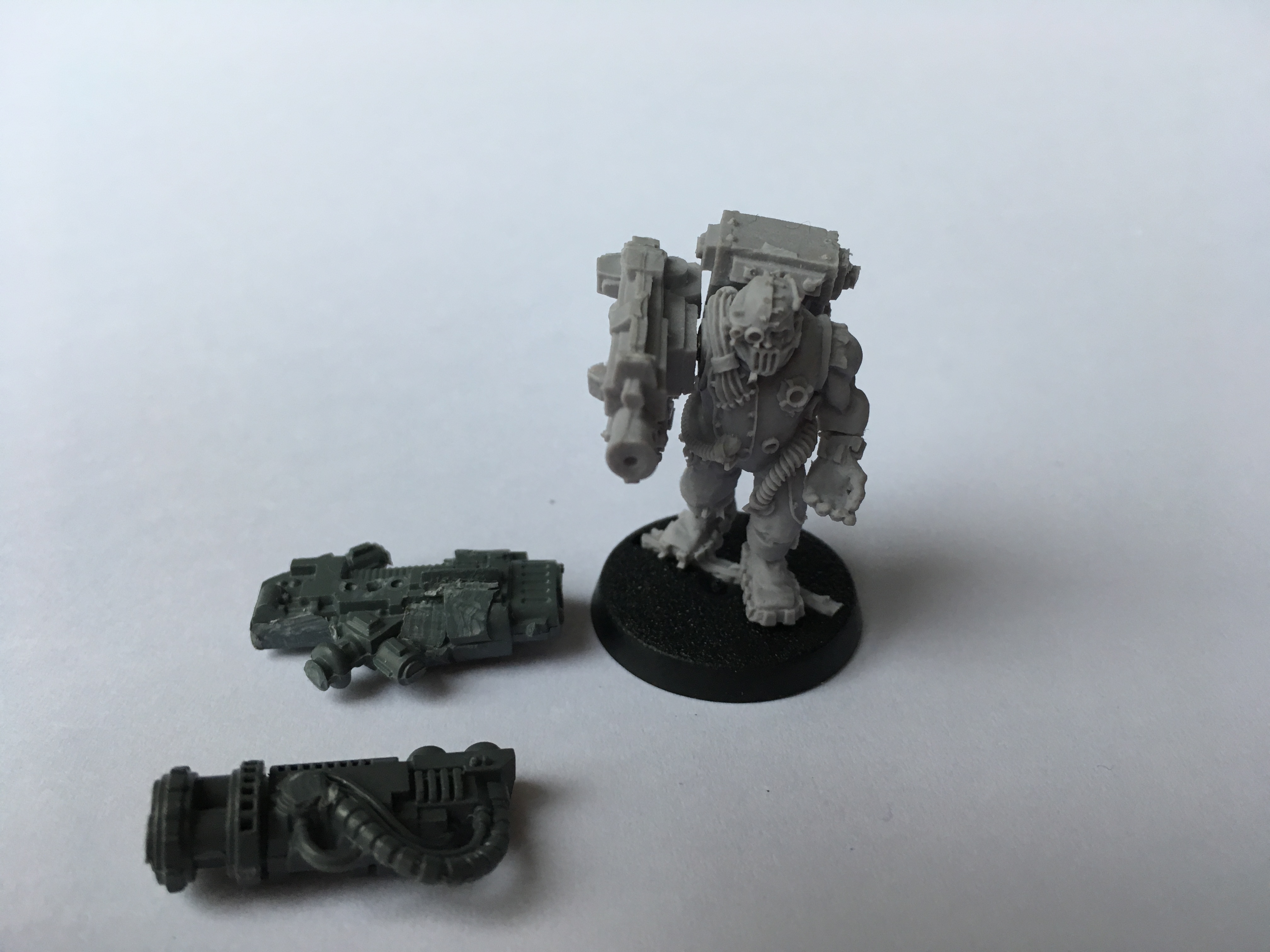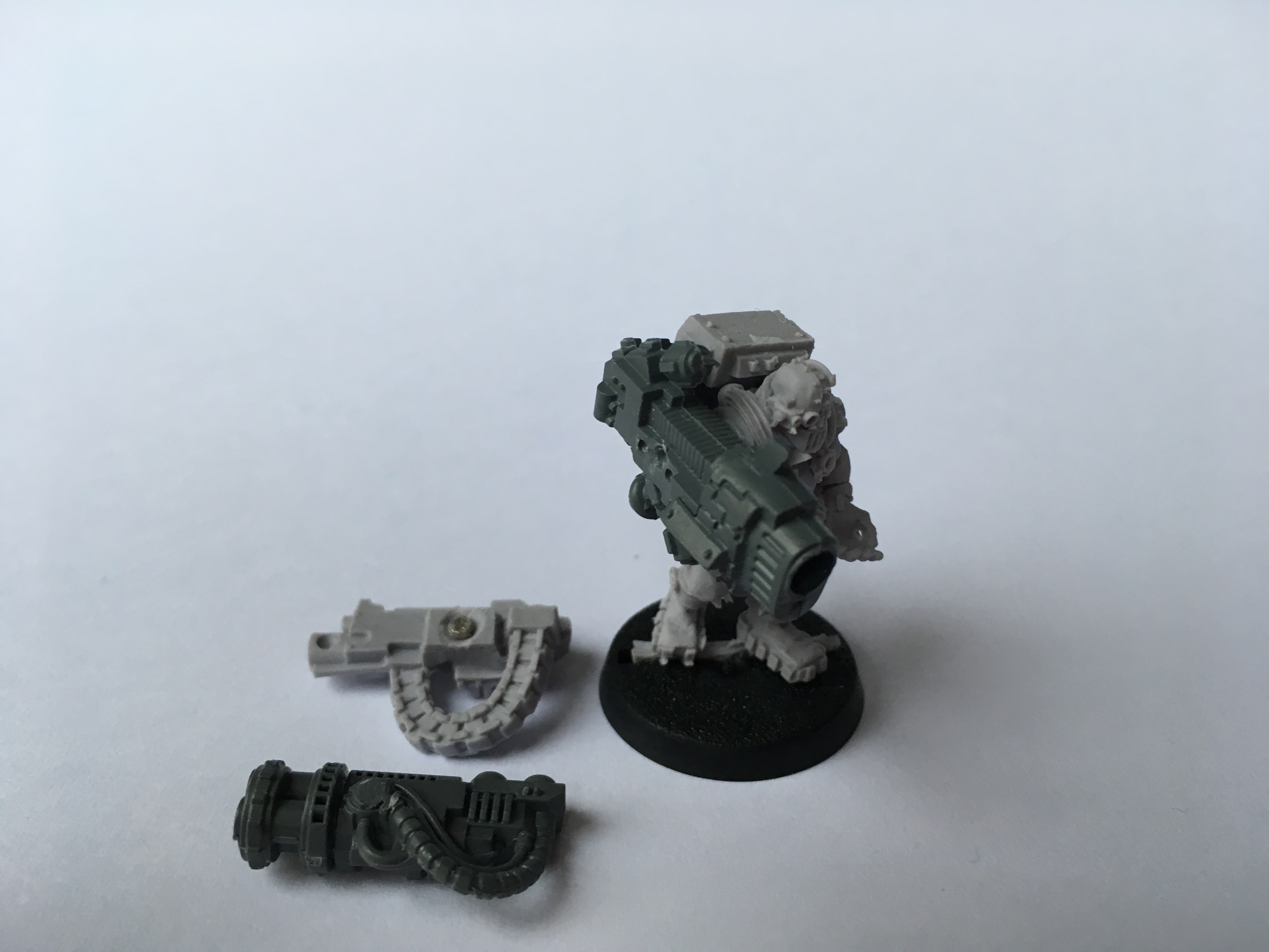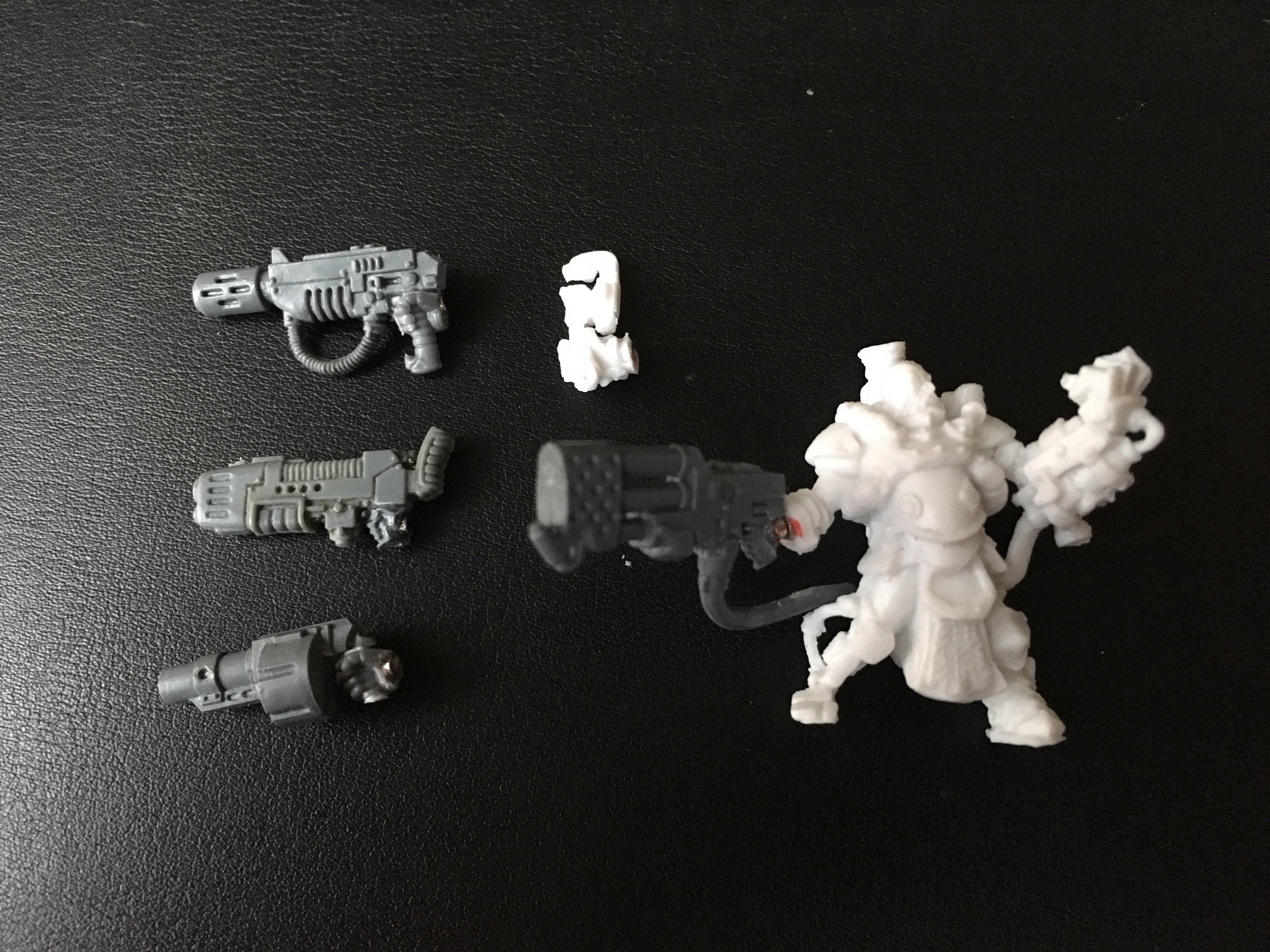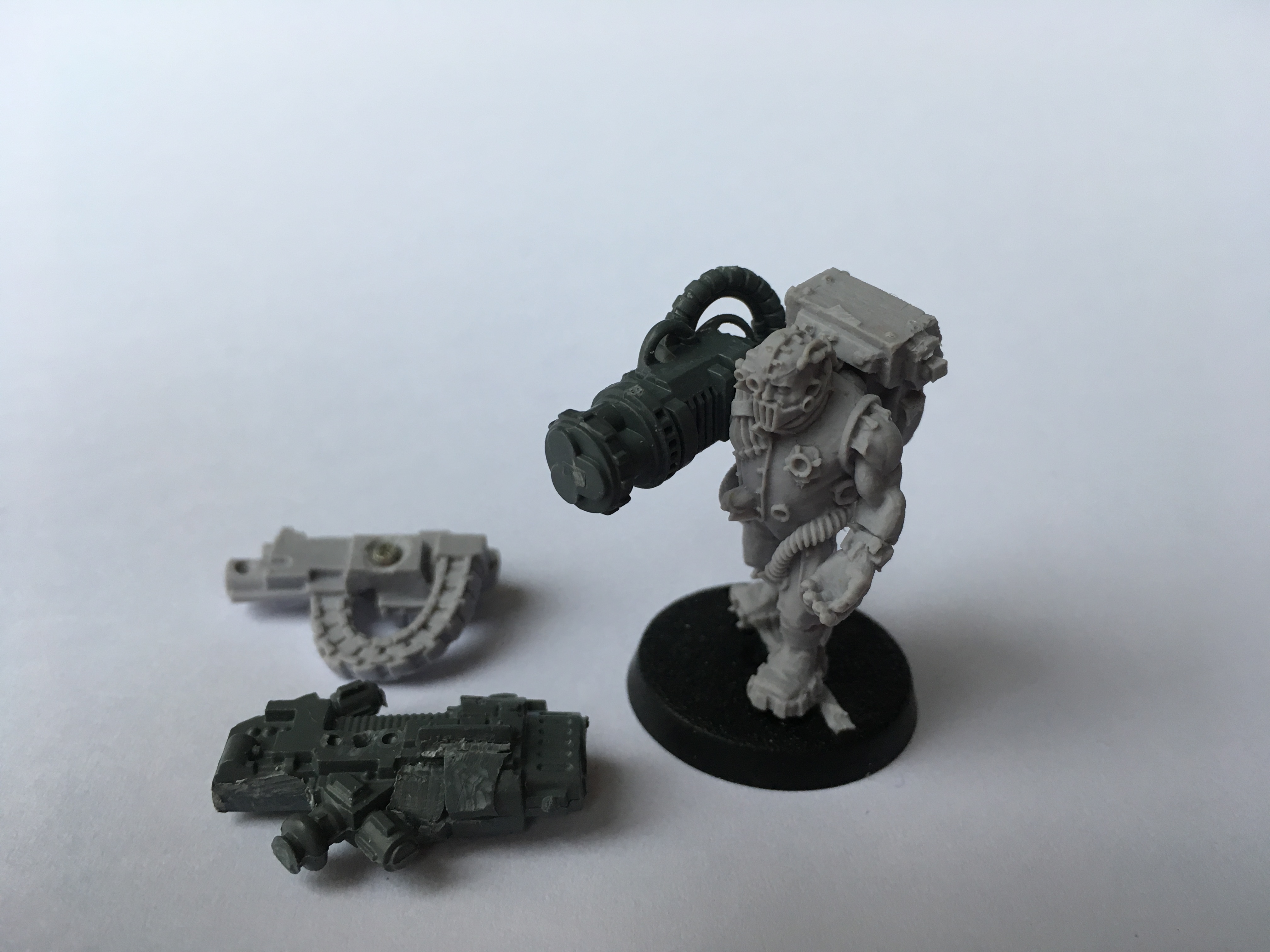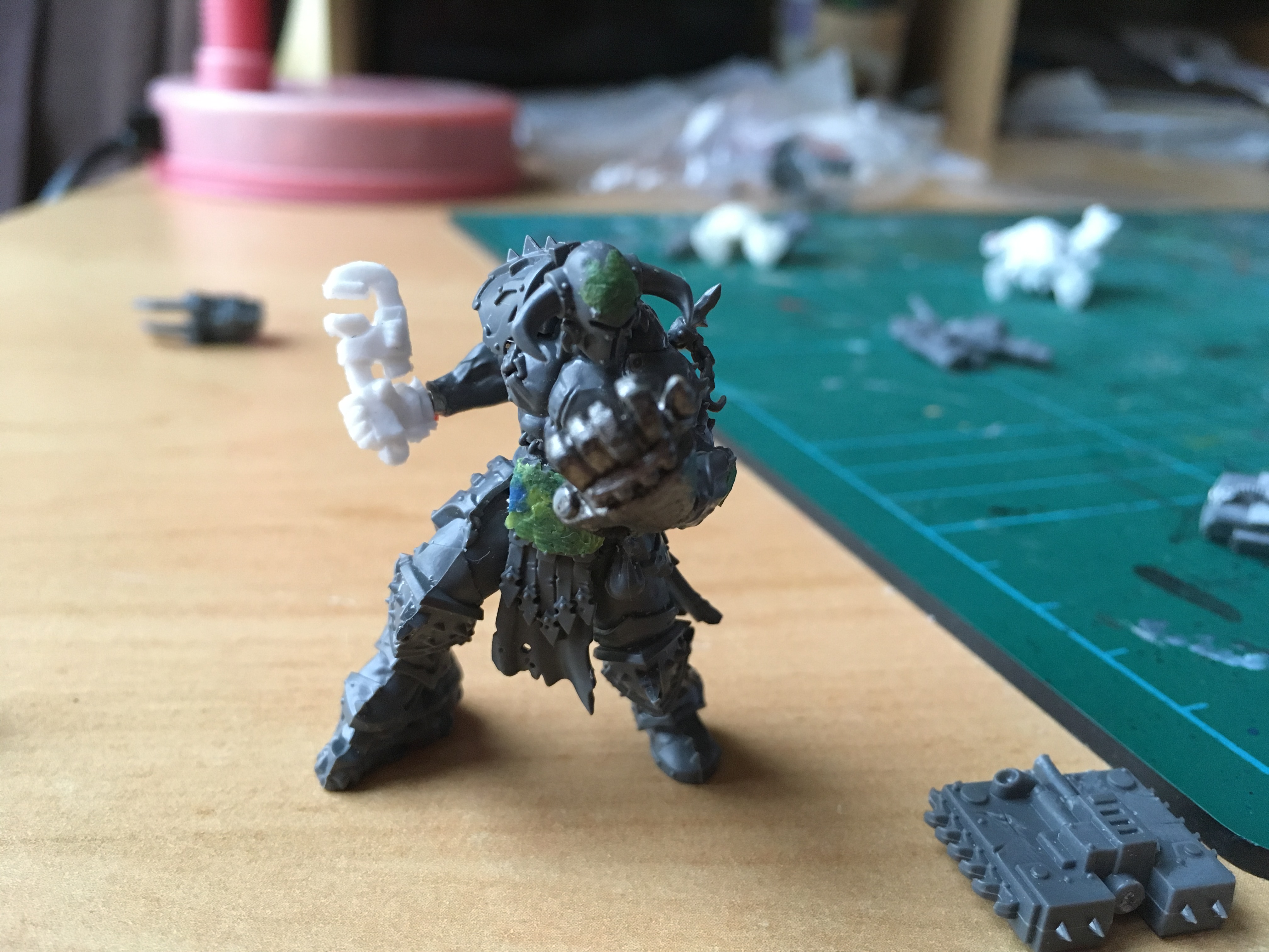 next comes the escaped pit fighters and their techno. all the parts are magnetised as I was feeling adventures us (read lazy and cheap as I didn't want to make lots of models armed with different things). the slaughter priest looked like a great model to play with and model - apart from its huge in comparison to the other models - its right arm was initially magnetised in one place and would be fine adding on the ork bionics - until I realised that the leaders could have special weapons to. so I cut up the sword arm and added in another magnet as it wouldn't have looked right otherwise (basically a hand coming out of the elbow).