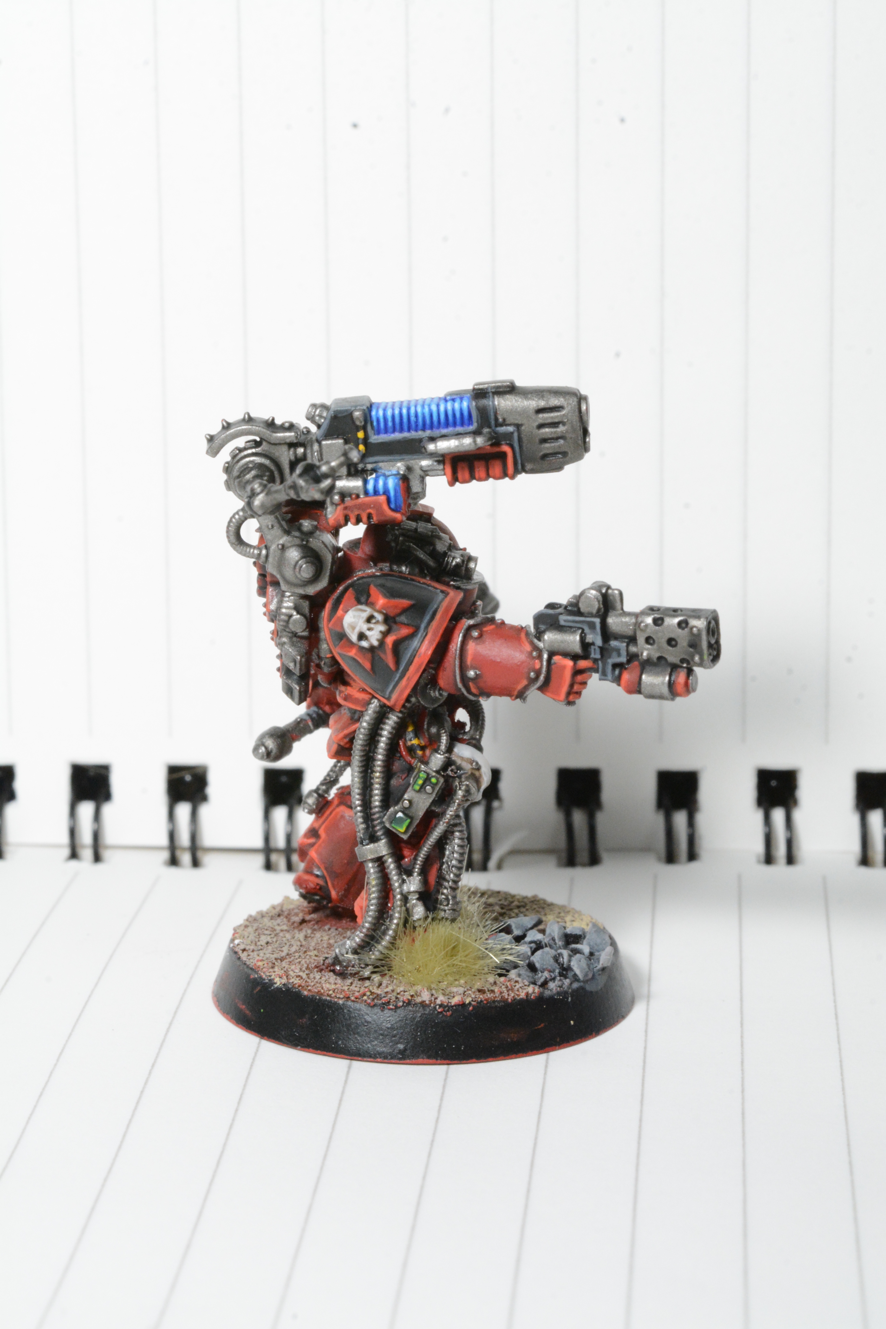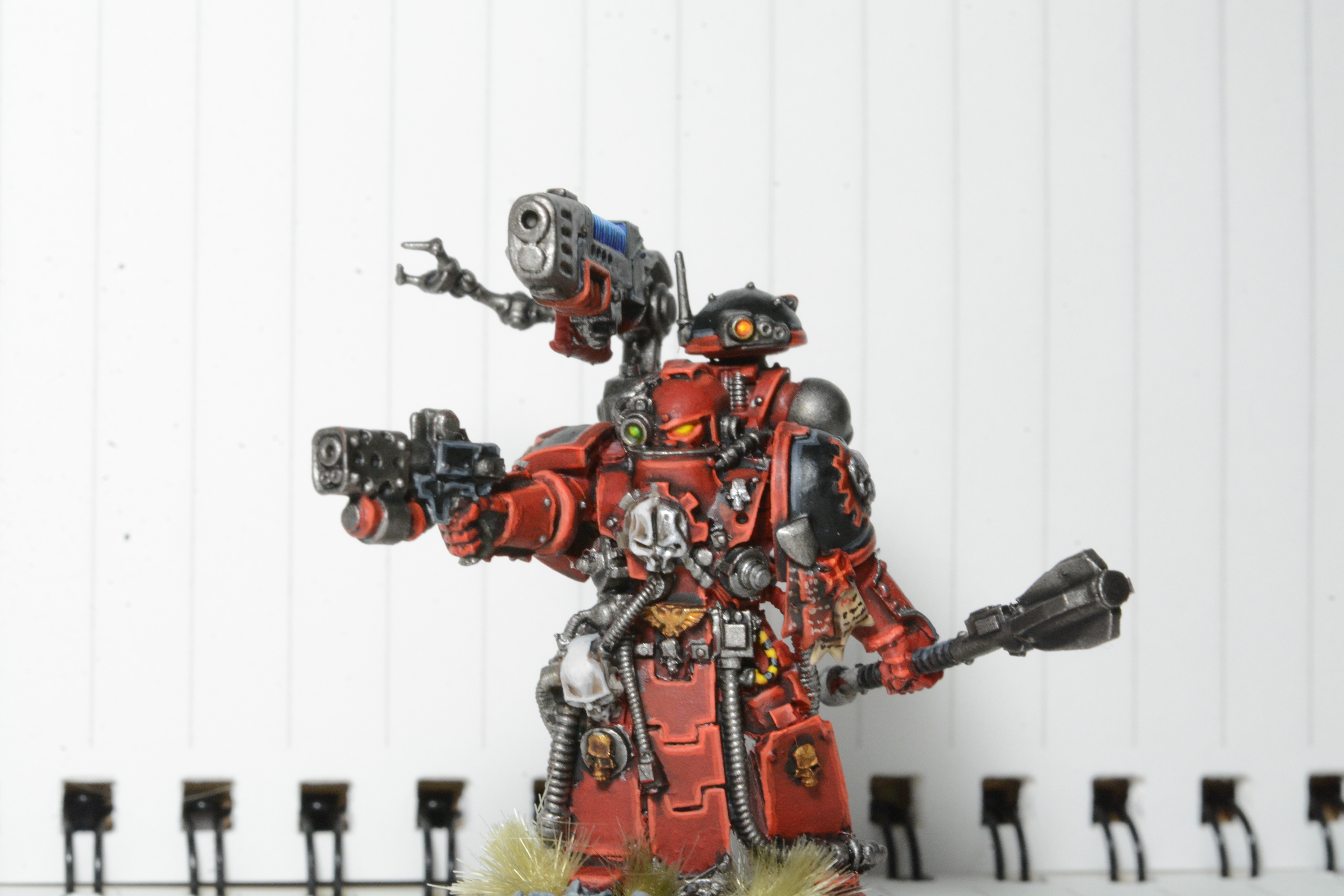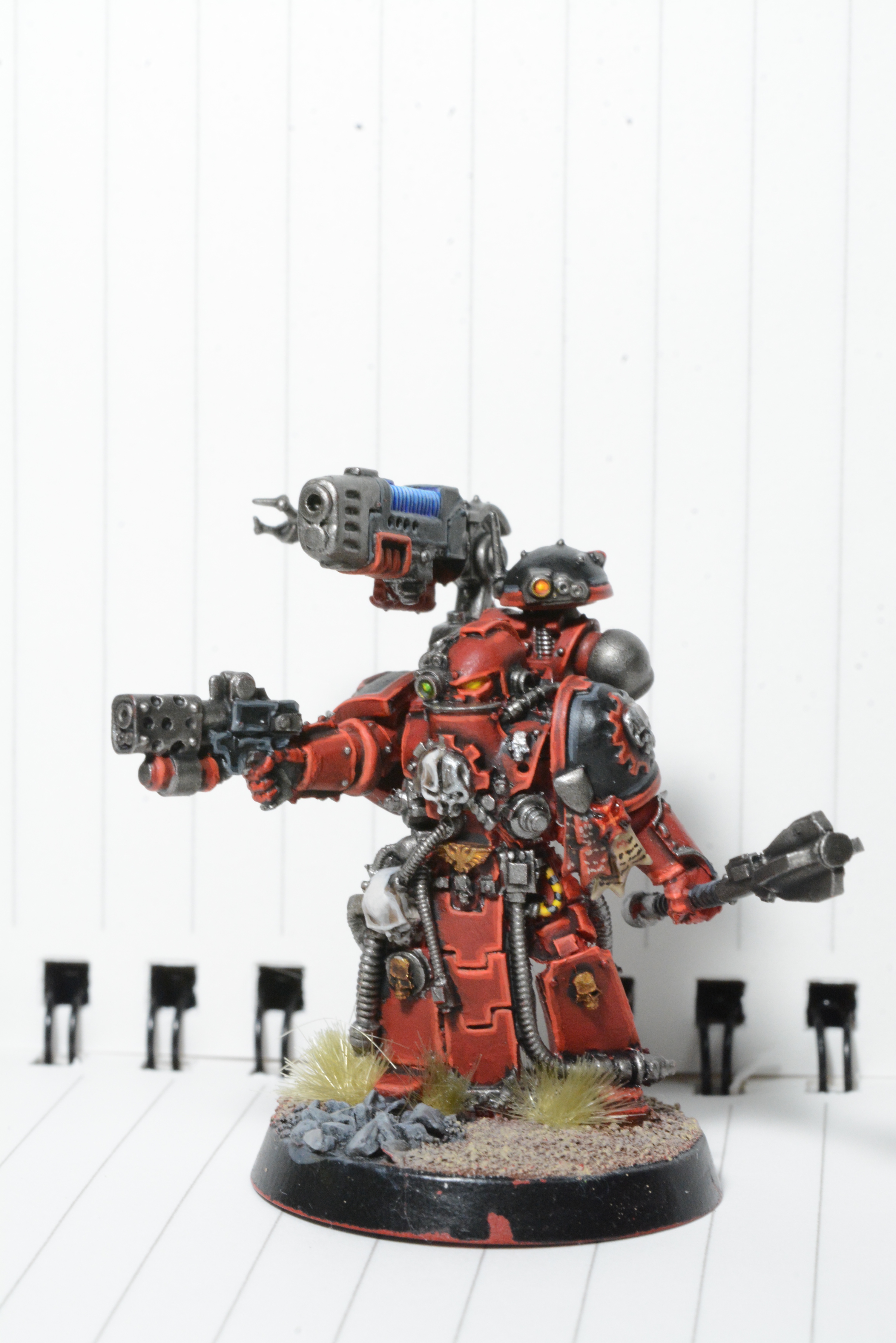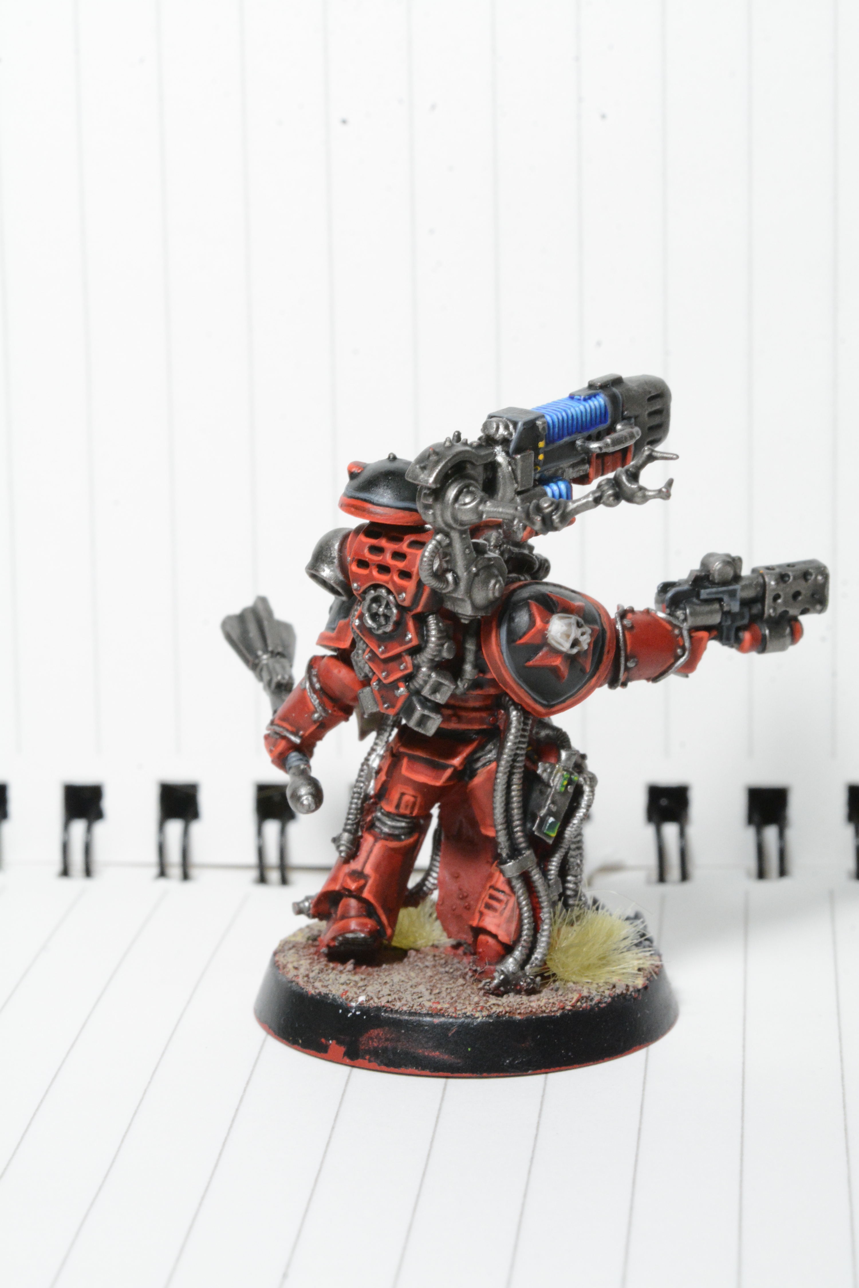 The colour scheme was based vaguely off of the tech-marine in Damnation Crusade, with a few liberties taken with his pauldrons, but I think the overall effect is templar-y enough, but also mars-y, too. I opted for the mace because it was what I had to hand at the time, and also because I felt like he needed something a bit more medieval to fit in with the templars - I like the tension between zealous martian machine cults, and the fervent religiosity of the templars, so I thought he'd probably want to prove to his brothers that he hadn't strayed too far from the path of beating your opponents to death. The hand-flamer was a coincidence entirely, just idly fitting bits together, when I really fell in love with the look, and the rest of the servo-harness kinda evolved from that.
