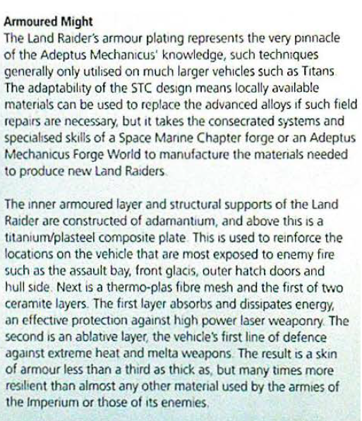 now that said keep in m ind the Land Raider is armored against DIFFERANT THINGS. sure the Abrams is tough vs HEAT shells. but how effective is it's armor going to be against a Plasma Cannon? or a Las Cannon? etc.