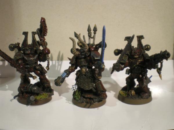 Without further mumbling I present to you a squadron of Khorne-alligned power armoured brutes. They may appear to be Khorne Berzerkers, but in game terms count as MOK CSM (hence the meltagun per squad). Fluffwise they are partially ex-World Eaters who have resigned their legionary path and have gone their own ways, with parts of other legionaries or by themselves. They are now in this yet-unnamed warband because theyre equally fed up with legion and imperial affairs and would rather make their own realm of residence...