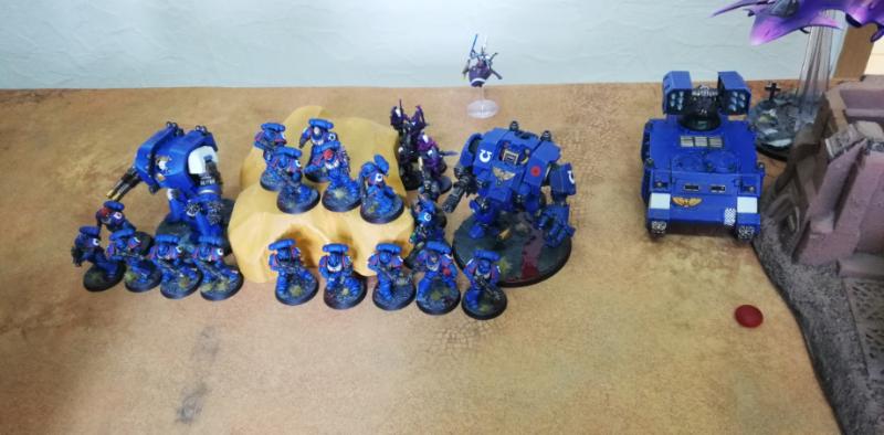 In our last game we faced Alaitoc Eldar and Guard. They had the advantage playing dawn of war deployment and long range guns. I couldn't do anything but advance all my stuff in the first turn and pop smoke.