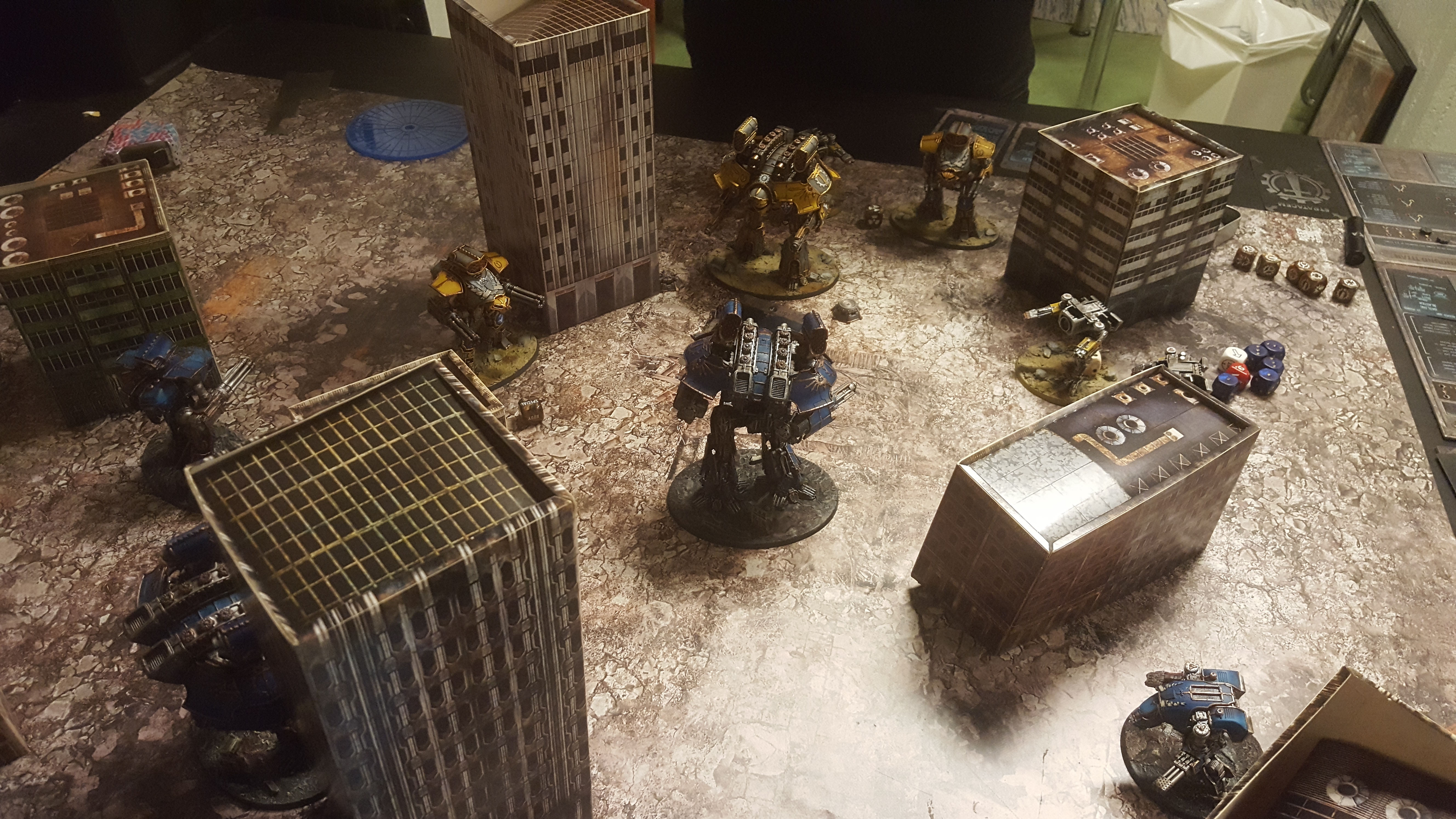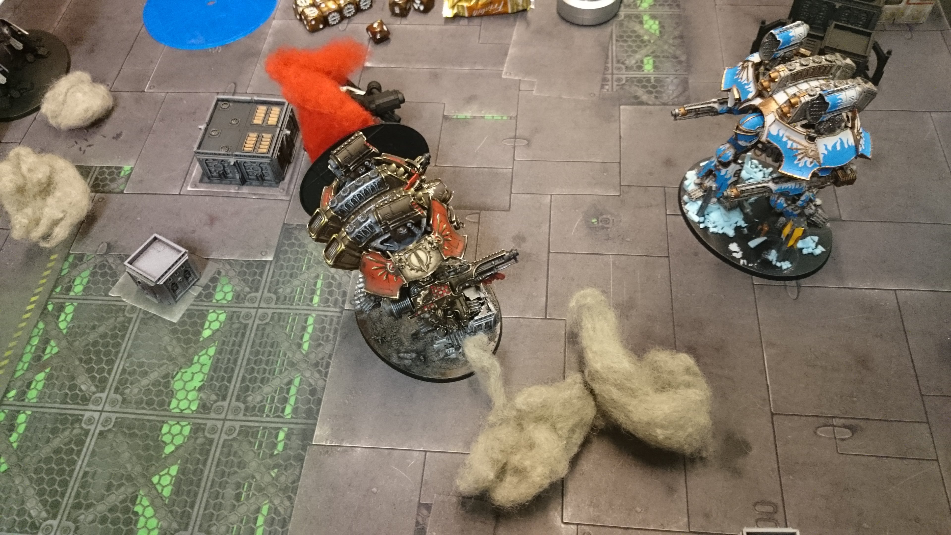 Senior Princeps smack each other about on the right flank after I blasted his Reaver apart, making it fall on top of the hab block and crush it under its toppling weight.