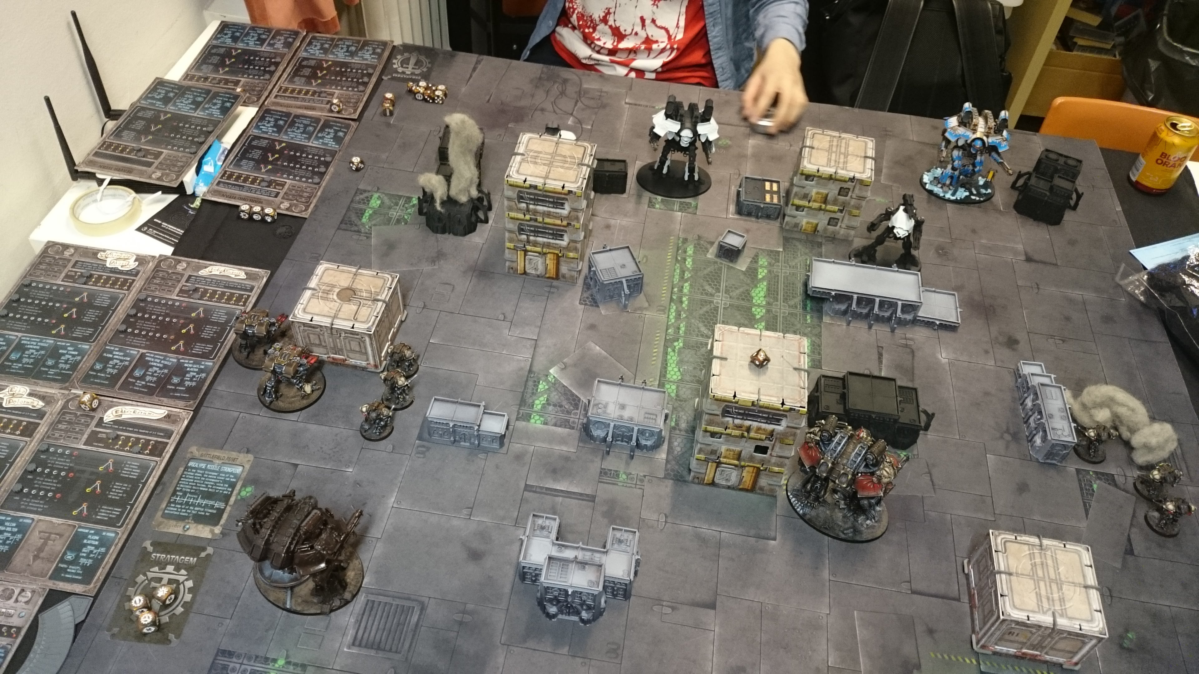Off to a hectic start we went: my right Knights vaporizing under volcano cannon fire after their cover got blasted to bits and his Reavers, under heavy fire, both fried their VSGs via Voids to Full! by turn three. My Warhounds legged it behind the buildings as a pair, sharing their shields as they went and holding pretty well under some indirect shrapnel. Until the one with the package got Sabotaged mid-Full Stride and found a few targeting beads turning to its direction. Uh-oh. Edax Rerum, its packmate, immediately used its Stride to bodily shield the important, and now unshielded, one from fire by granting it pretty good cover. That worked well enough for a while and as they dodged massive damage, I covered Echo with smoke and the pair advanced, whereupon Edax Rerum got blasted apart by the Reaver-Warlord combo, standing there dead and silent. Well, until we remembered that being on orange reactor actually adds some to the roll, thereby making it a tumble and as luck would have it, he first stumbled towards the low wall in front of him and then bounced back, falling on top of Echo and injuring its legs. Great job guys, great job.