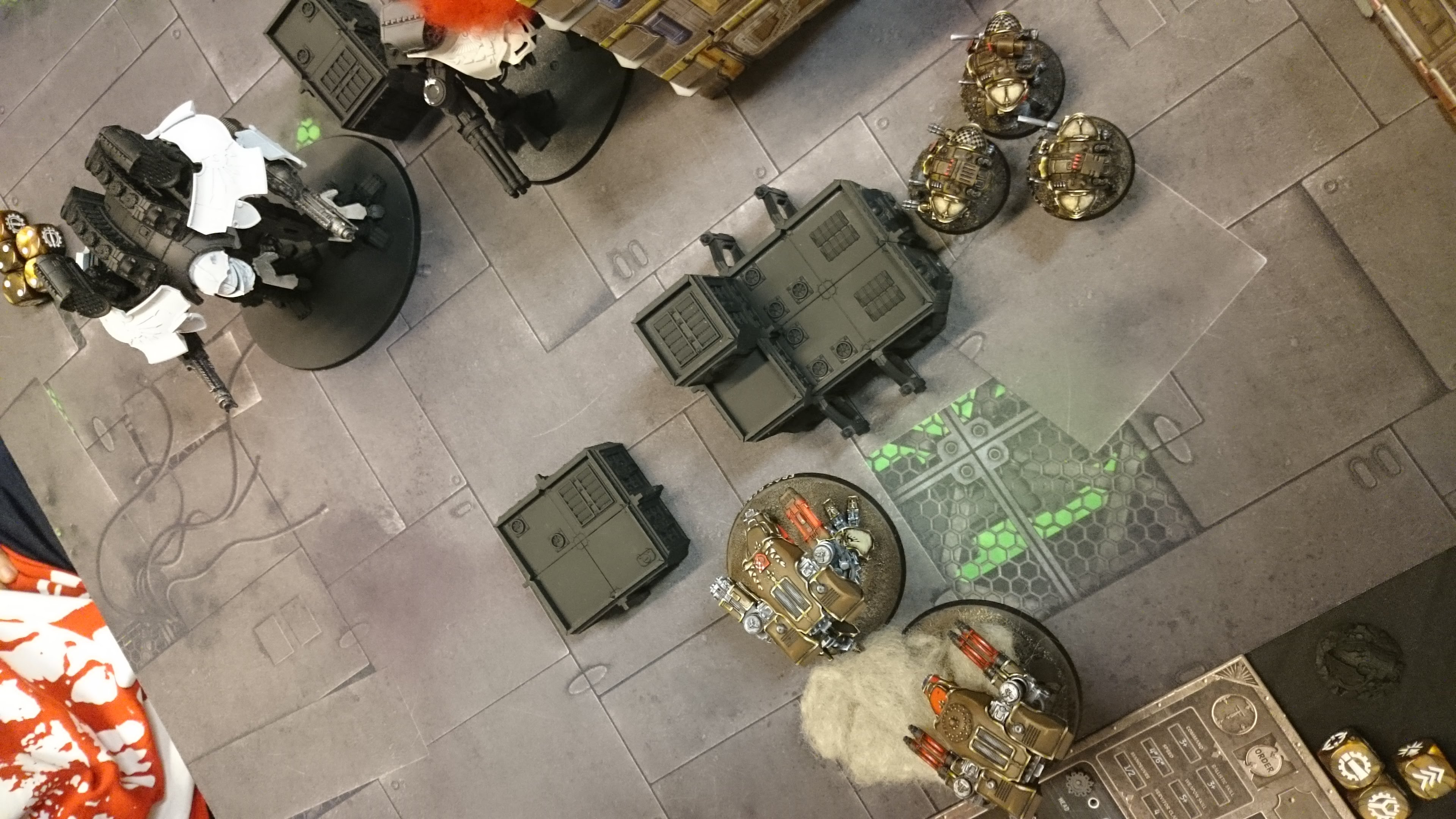 Turn 1 i did advance on all. Tried to use warhounds to make opponent think one carrles. Much to my surprise warhounds on left headed center leaving reaver with dual gatling vs warhound and cargo reaver. Firepower started bad for him but eventually rolld 4 fails to non-cargo reaver. Ouch. Turn 2 i should probably have emergency repaired but advance on all again.