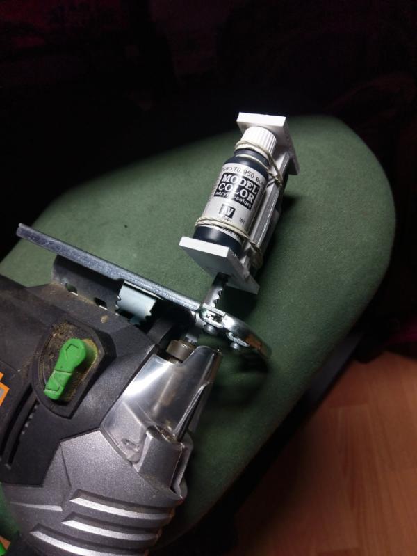 I did the same thing, using a 3D printed armature I found on Thingiverse. Clamped to my jigsaw blade and does a fantastic job of shaking up paint. Unlike a paint stirrer you don't need to clean anything, and it absolutely will completely liquify the paint.