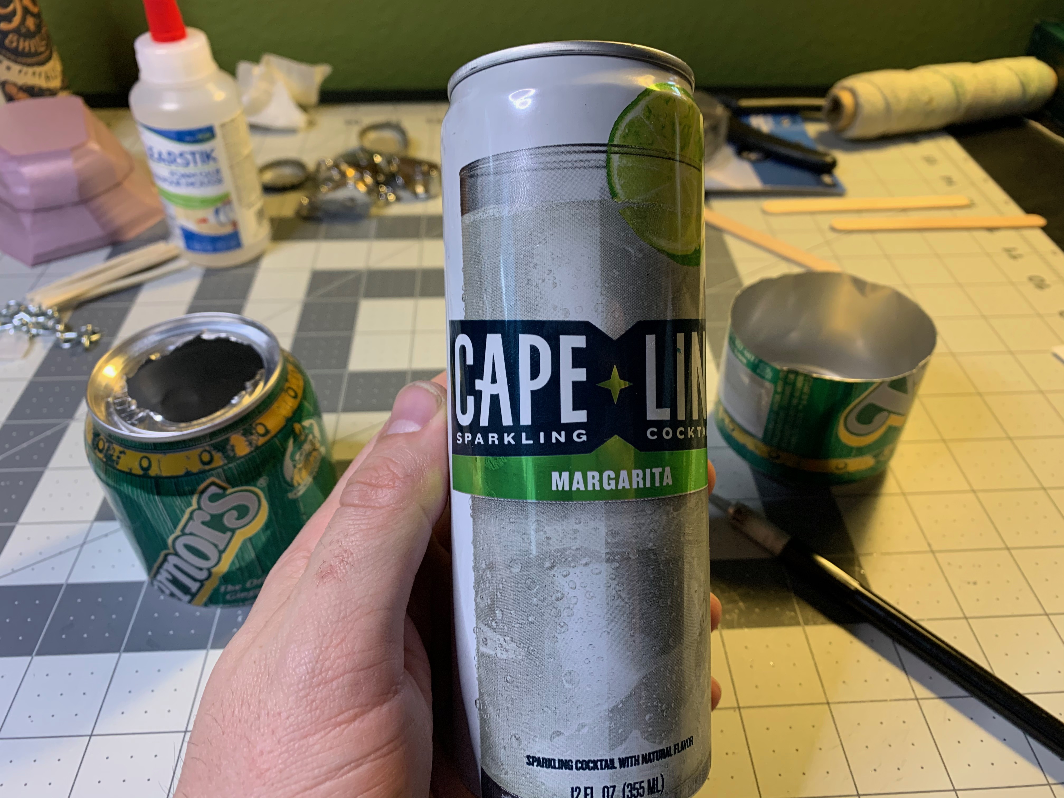Anyway, Thumpingbear has generously allowed my Tropicana bottle caps to qualify me for the "beverage container" threshold, so I can drop the material that was giving me fits this time. I was going to use those skinny soda cans as the columns under my bottle caps, but they weren't quite the right diameter. I started cutting them up, slicing off the tops and bottoms, slicing them lengthwise, and then trying to take a few millimeters out of the diameter and somehow reseal it back into a cylinder. Long story short, I was wearing out my hands again and getting nowhere.