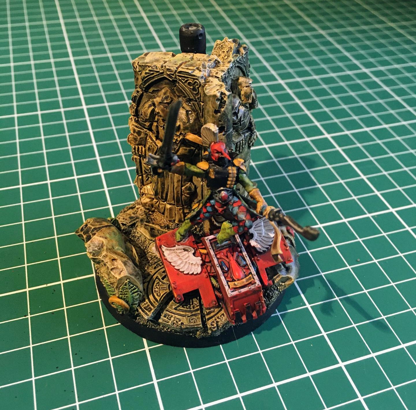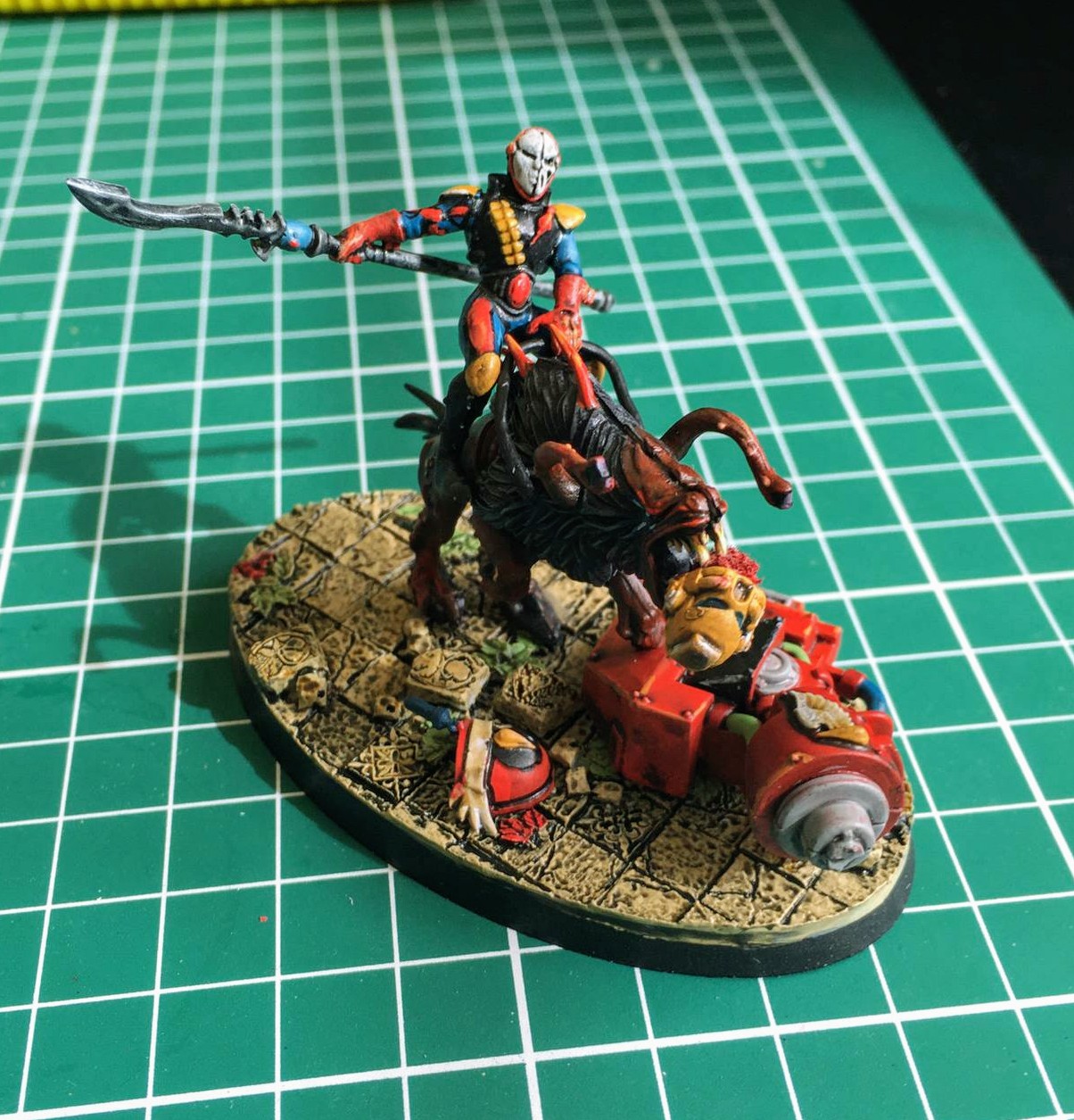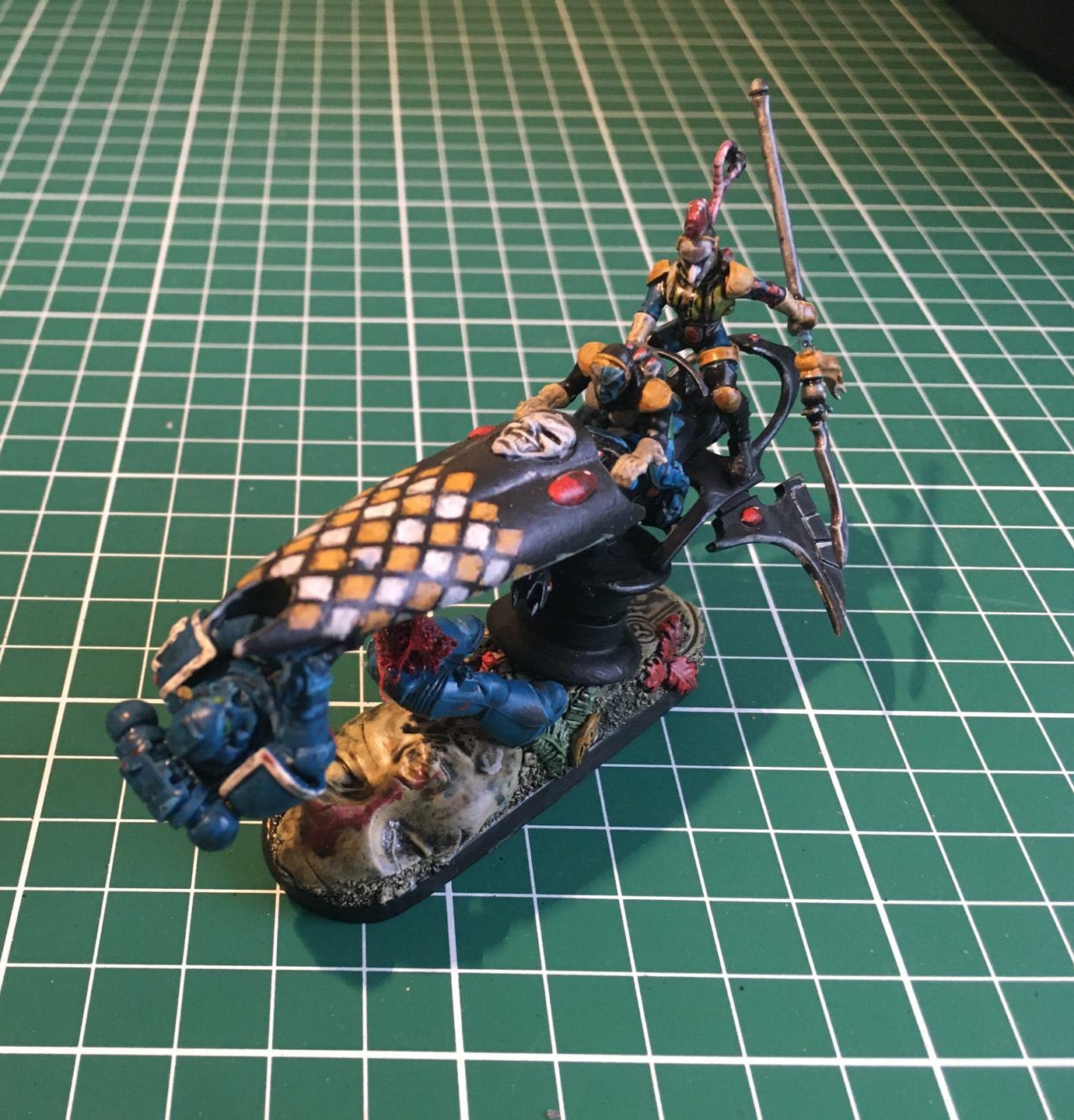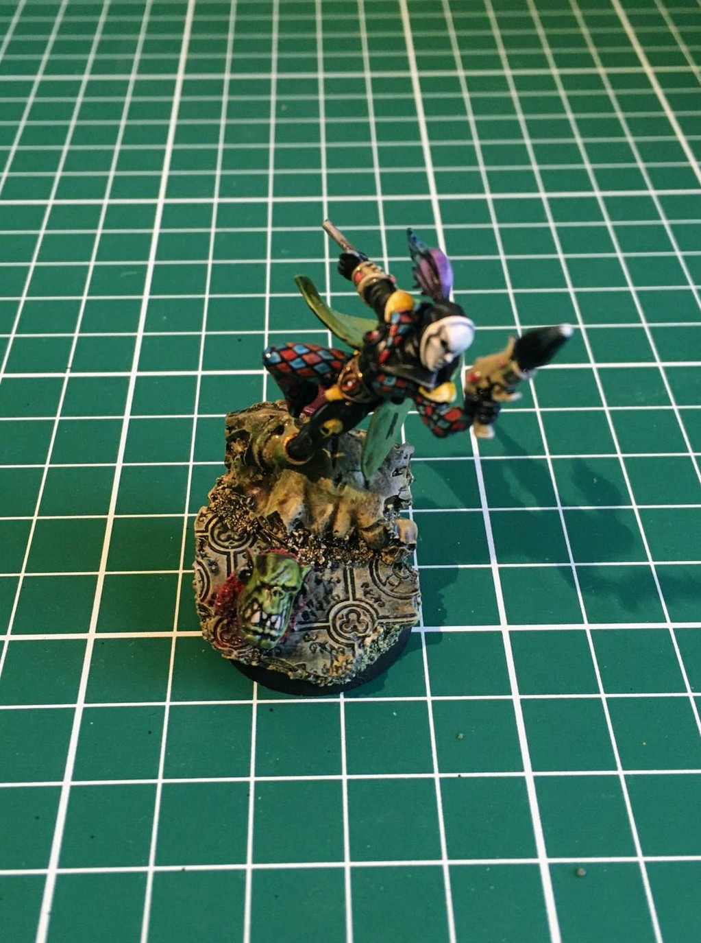 I think it does the job! Lends itself nicely to the underhivey aesthetic of the army. I'm not up to date with harlequin lingo but the last guy in the post two above this with the ork head on his base has got to be my favourite - great colours, pose and lovely work on the checks.