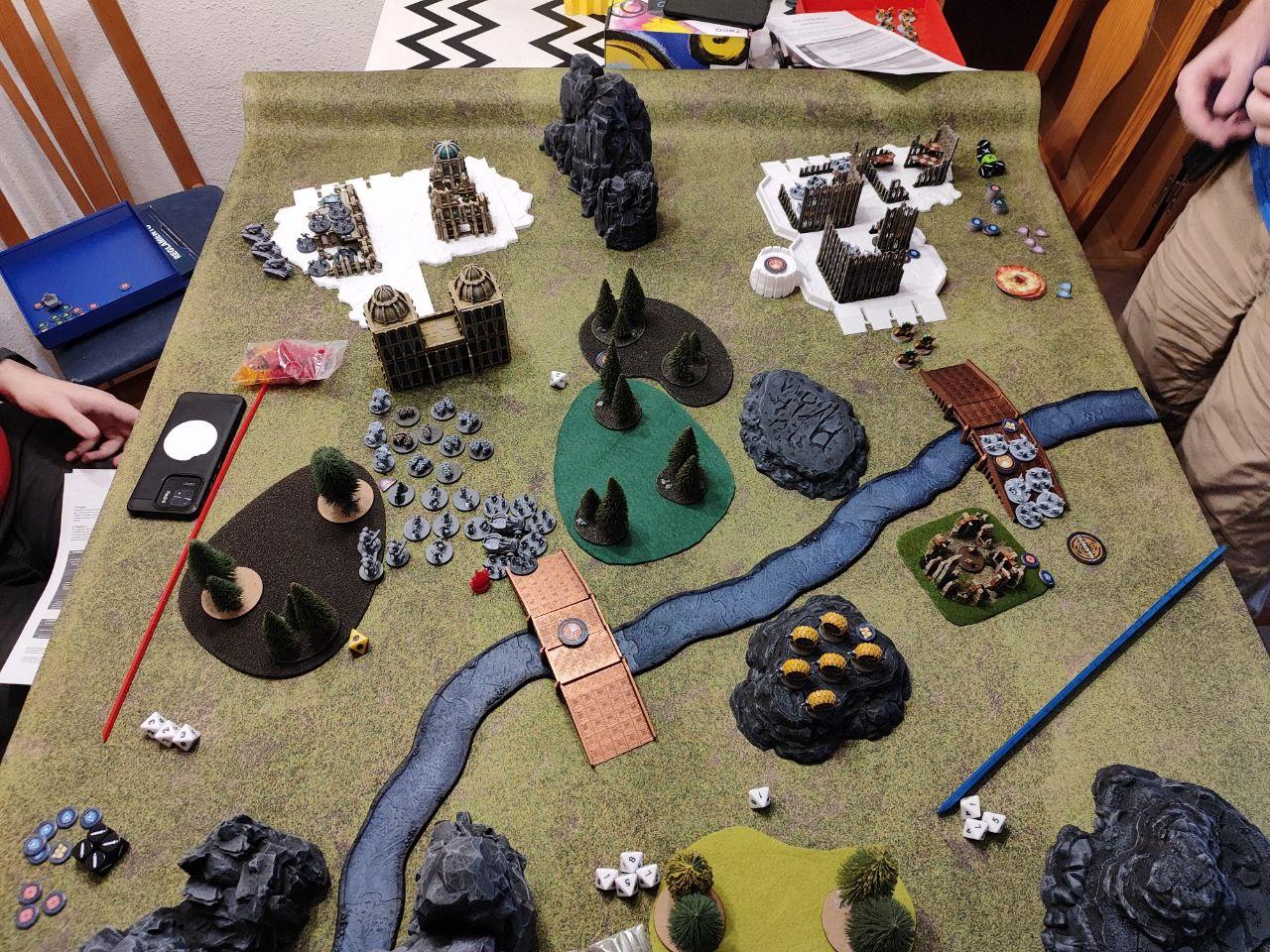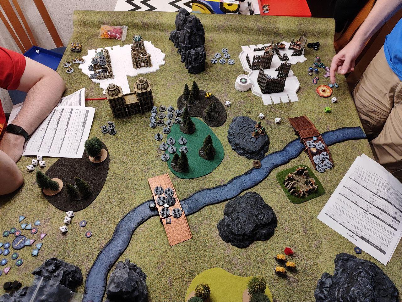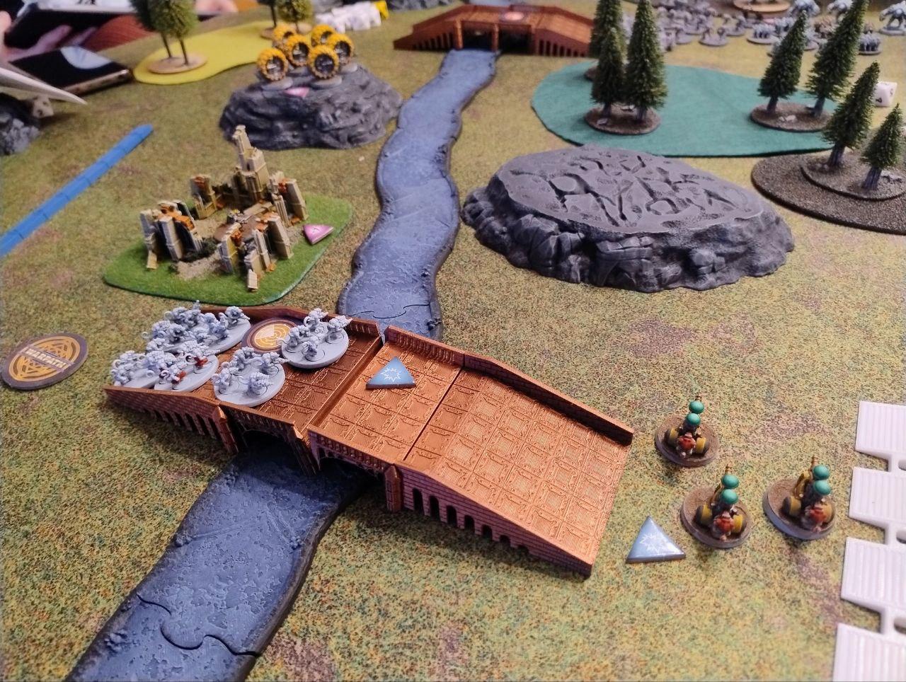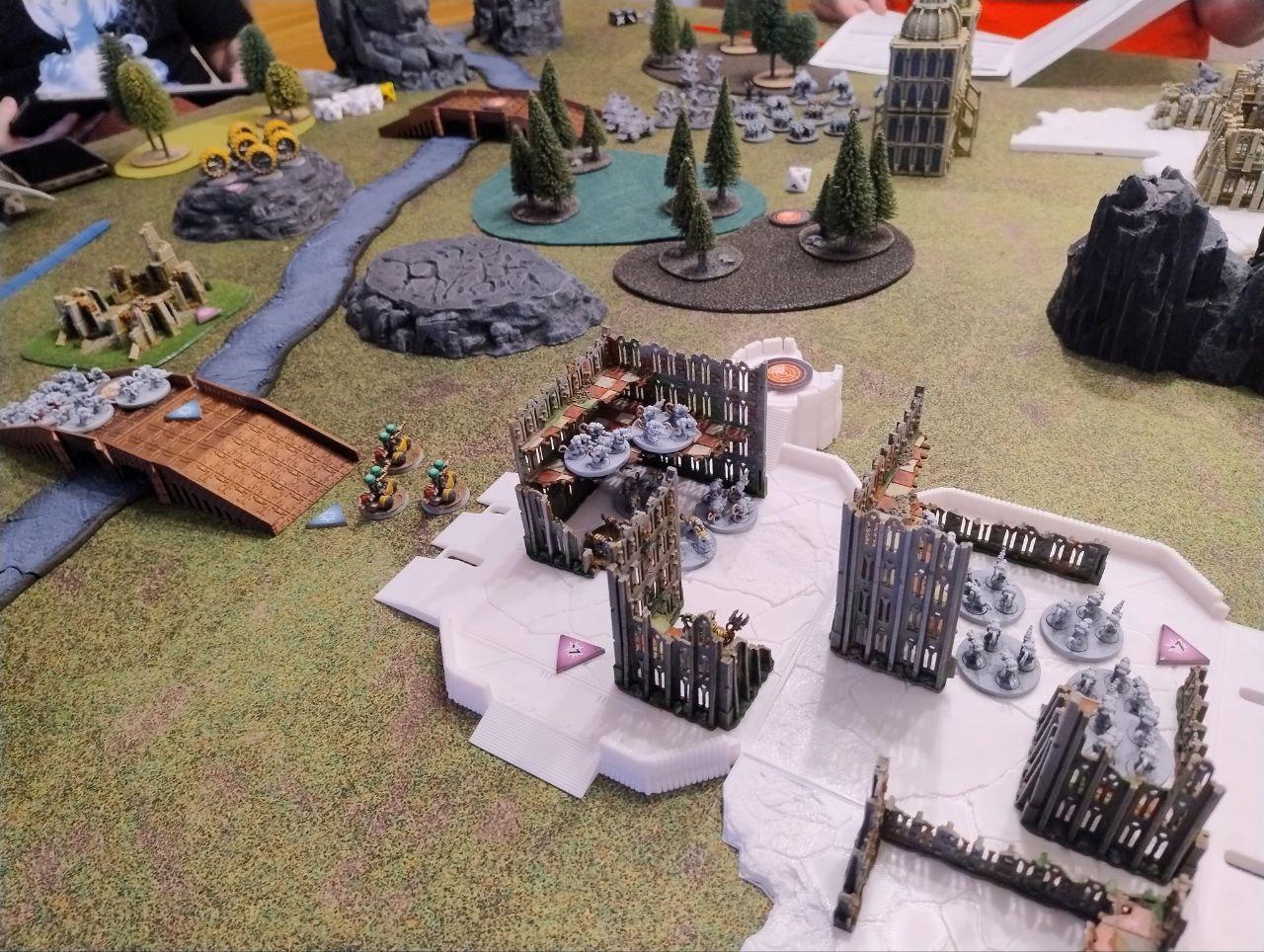 - Objectives: Placed by the players. Three dynamic objectives on the table and two static objectives, one on each player deployment zone (On the above map, the players put the static objectives one the northern ruins and on the southern bridge, while the three dynamic ones were places on the northern bridge, the middle forest and the top edge of the southern ruins. All three dynamic objectives started disabled (we rolled for each, I didn't find anything about it on the rules).