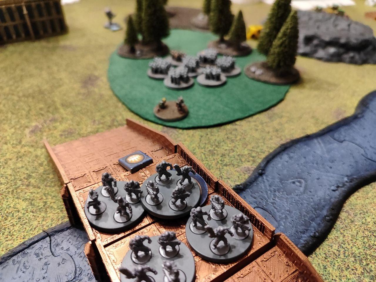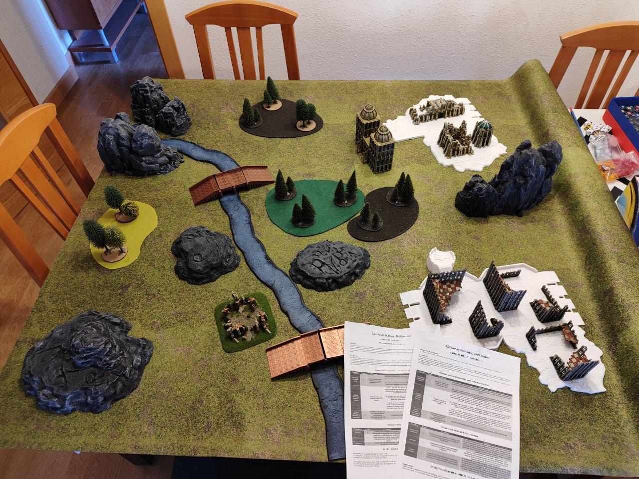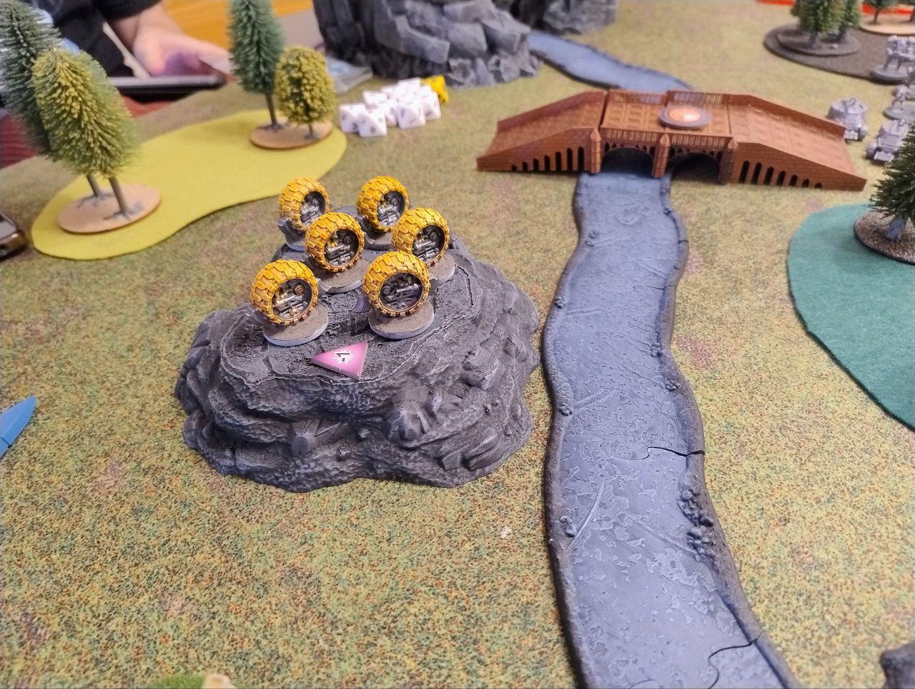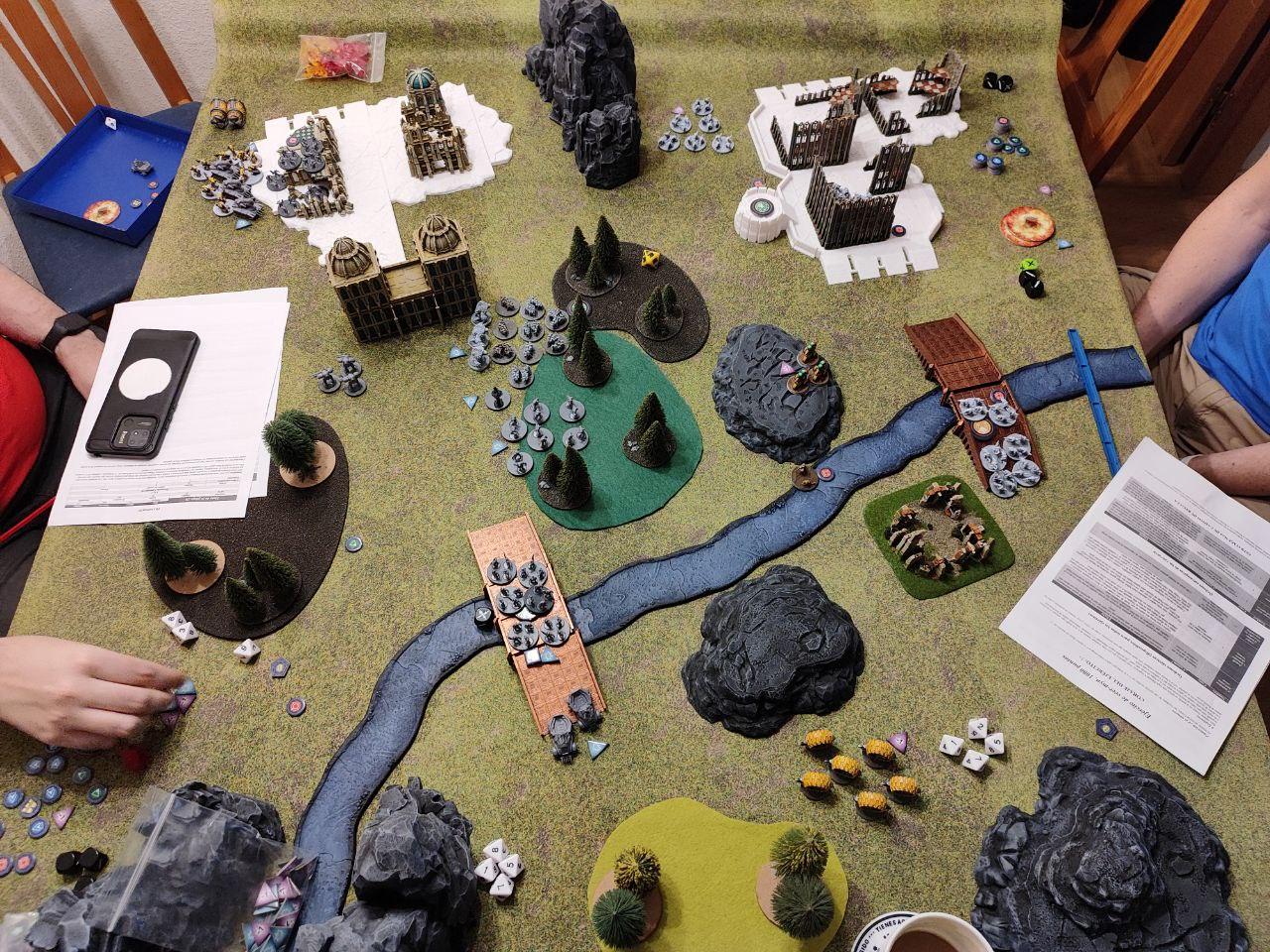 - Objectives: Placed by the players. Three dynamic objectives on the table and two static objectives, one on each player deployment zone (On the above map, the players put the static objectives one the northern ruins and on the southern bridge, while the three dynamic ones were places on the northern bridge, the middle forest and the top edge of the southern ruins. All three dynamic objectives started disabled (we rolled for each, I didn't find anything about it on the rules).
