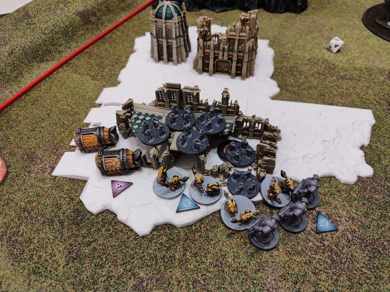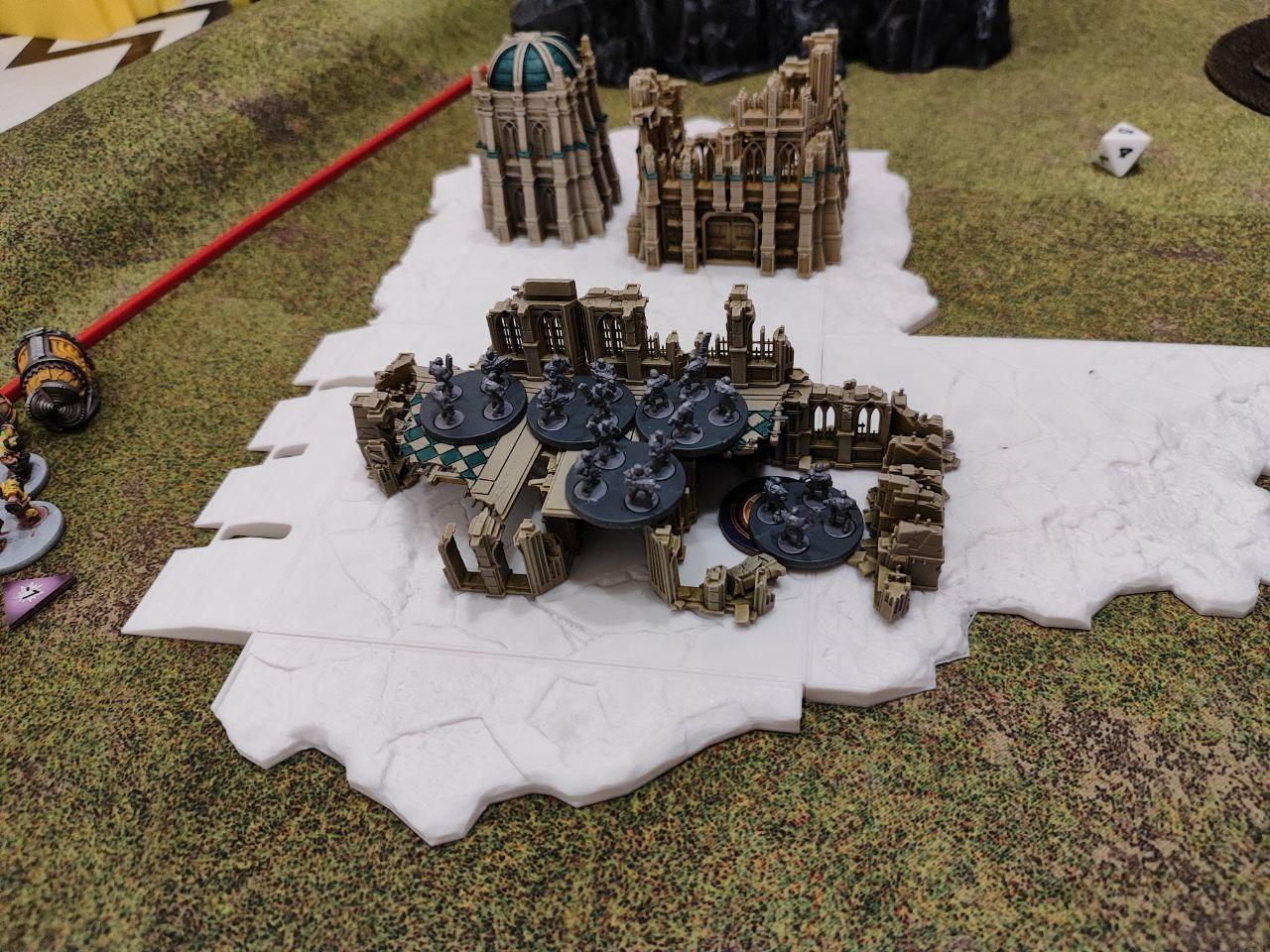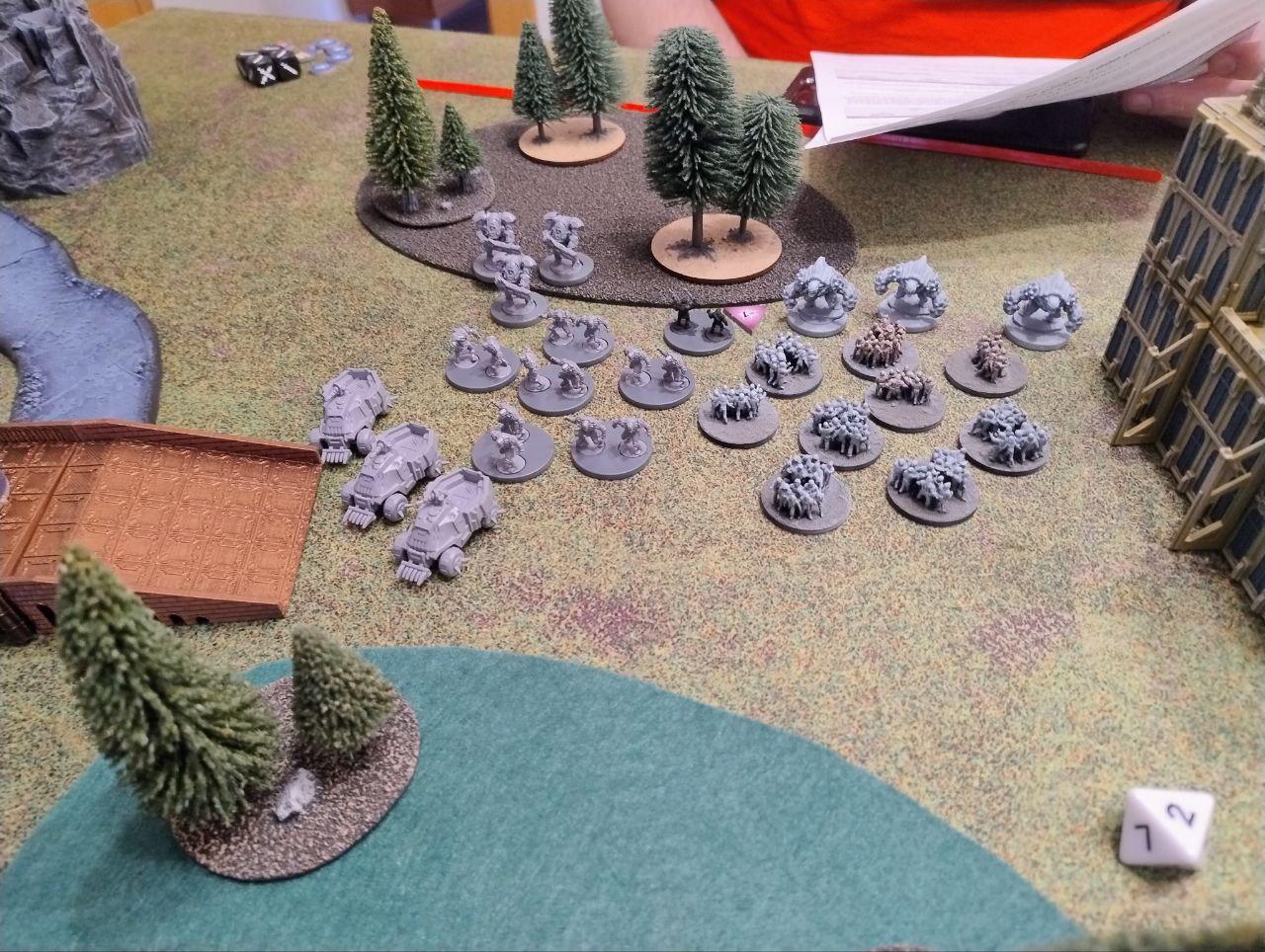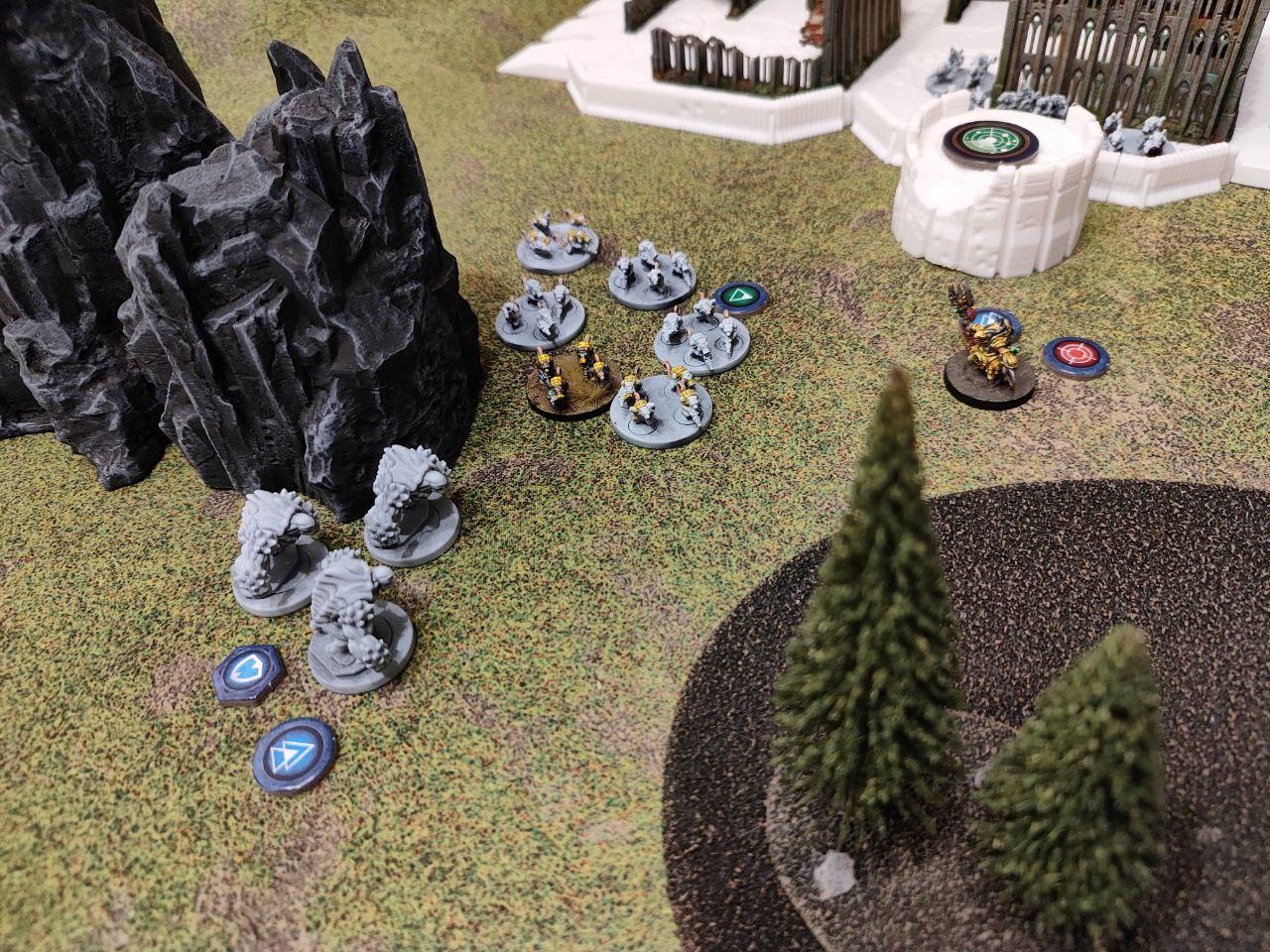 - Objectives: Placed by the players. Three dynamic objectives on the table and two static objectives, one on each player deployment zone (On the above map, the players put the static objectives one the northern ruins and on the southern bridge, while the three dynamic ones were places on the northern bridge, the middle forest and the top edge of the southern ruins. All three dynamic objectives started disabled (we rolled for each, I didn't find anything about it on the rules).
