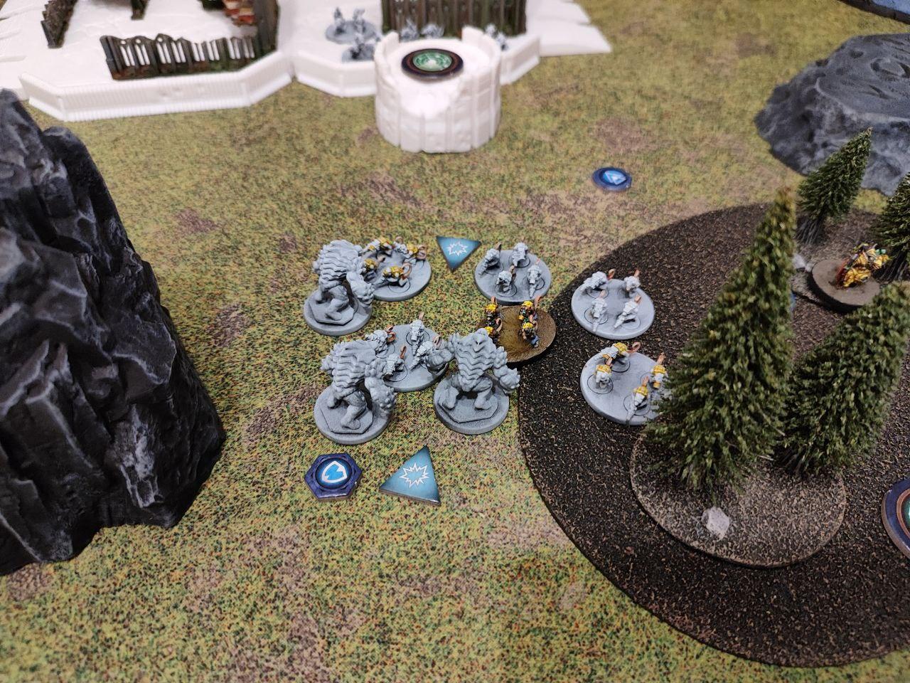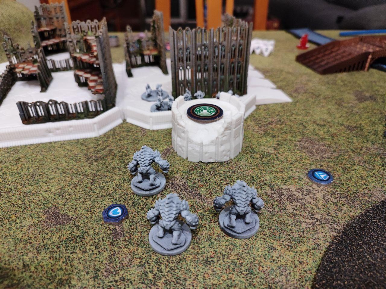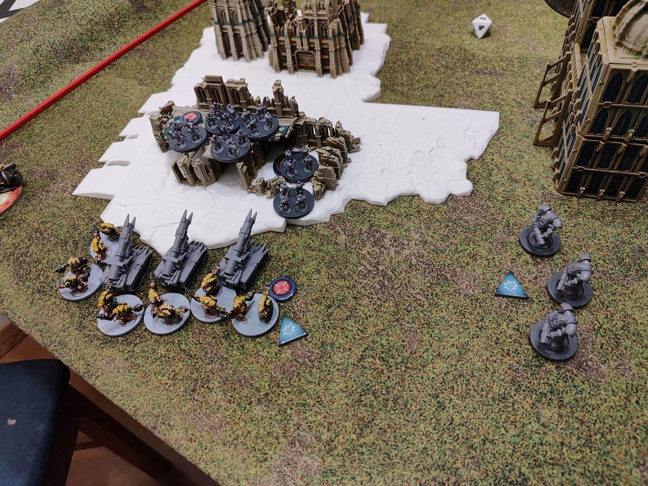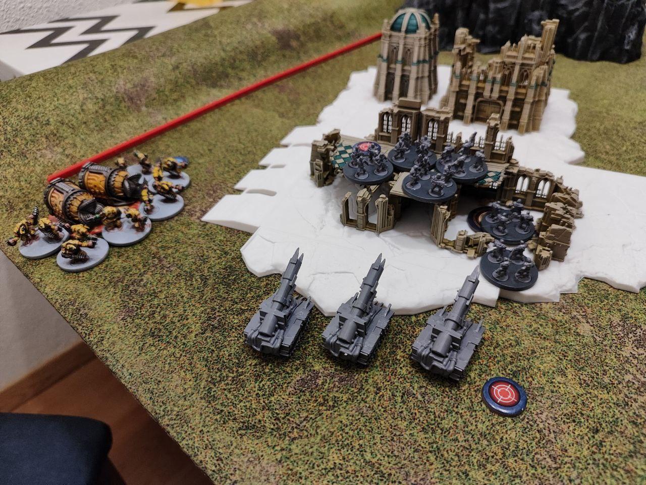 - Objectives: Placed by the players. Three dynamic objectives on the table and two static objectives, one on each player deployment zone (On the above map, the players put the static objectives one the northern ruins and on the southern bridge, while the three dynamic ones were places on the northern bridge, the middle forest and the top edge of the southern ruins. All three dynamic objectives started disabled (we rolled for each, I didn't find anything about it on the rules).