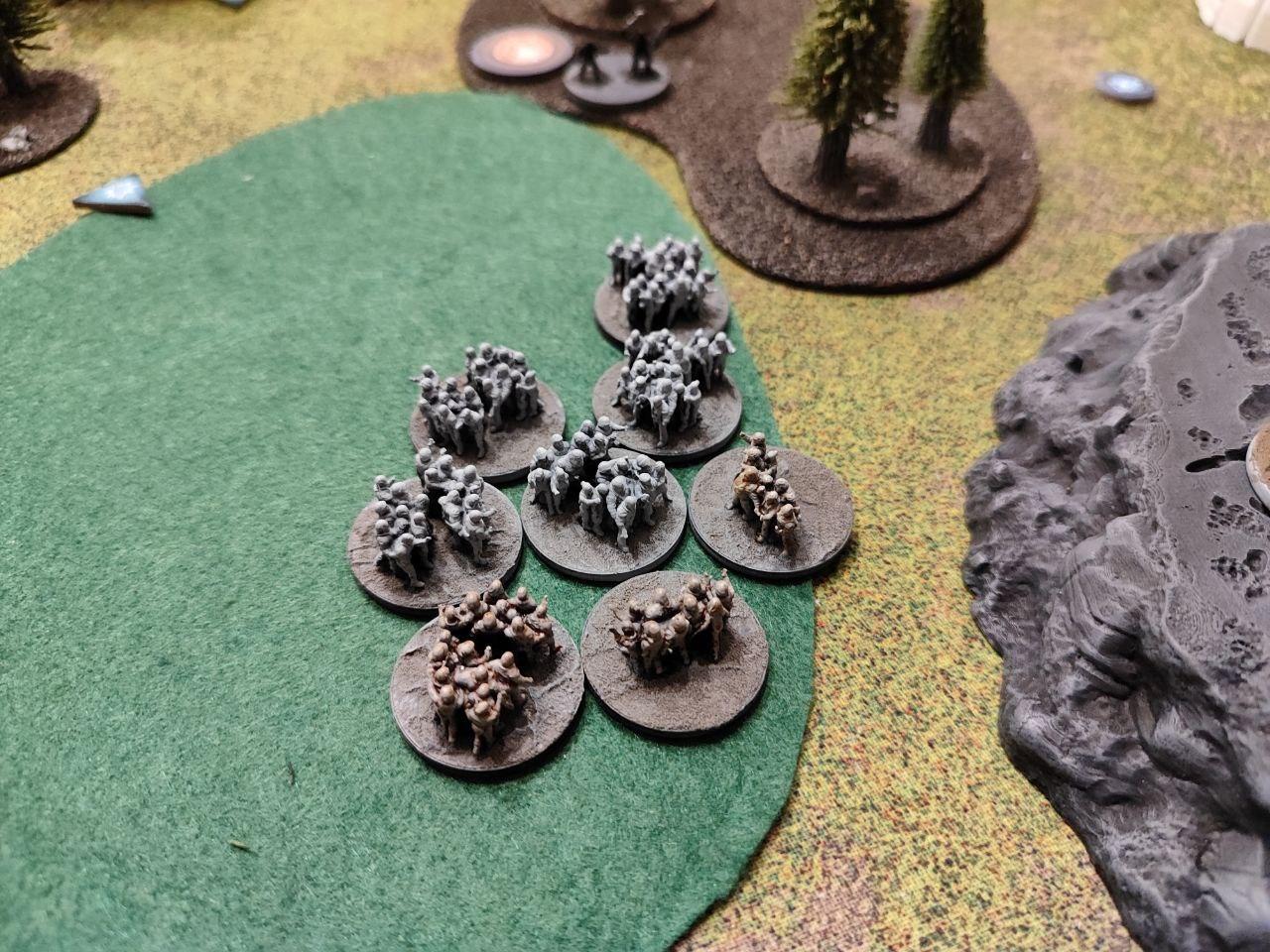 The plague Leapers cross the forest and gets shot to pieces by some incredibly lucky sustained attack rolls, while the tunnelers and the nightmares assault the ghouls hiding in the ruins, while the plague walkers decide to join in on the fun. The Tunner Runners destroy the surviving Mules, but then get shot and pinned by the Ghouls on the bridge. The zombies take and hold the center objective, and the Aberrations decide to go kill everything near the mountains.