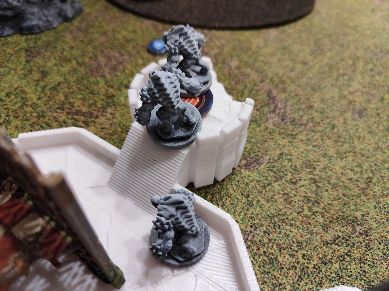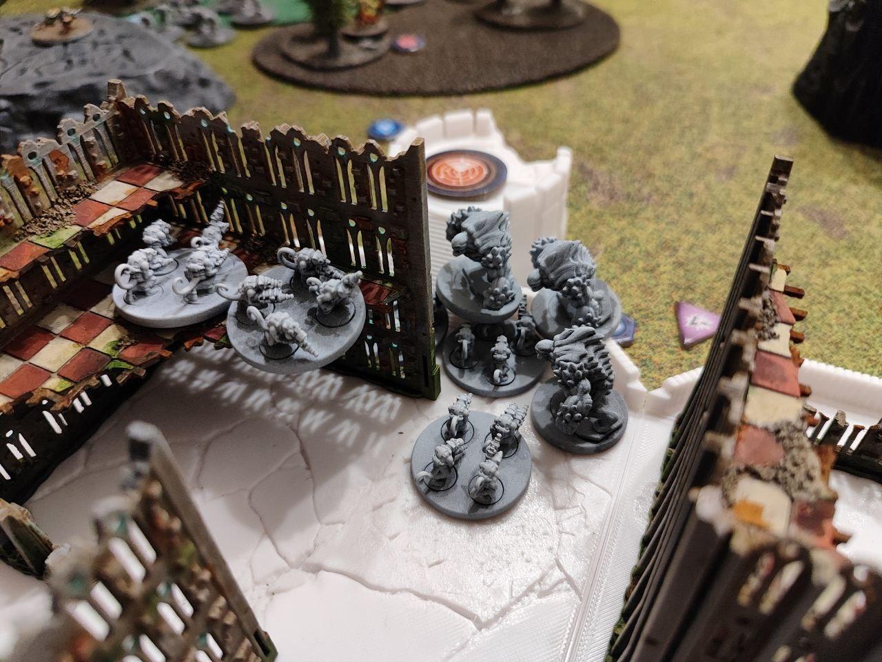 The progenitor manages to kill the last leapers while the brood mother flees from the abominations and orders the creepers to cover he retreat. The abominations promptly take the hind and assault the creepers. The Rumblers reposition to try and take a shot off the abominations, while the plague walker tries to catch up, and fails.