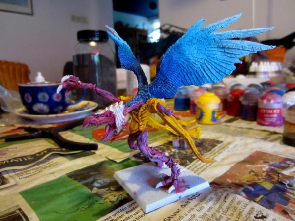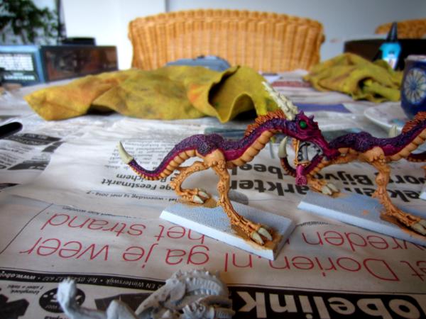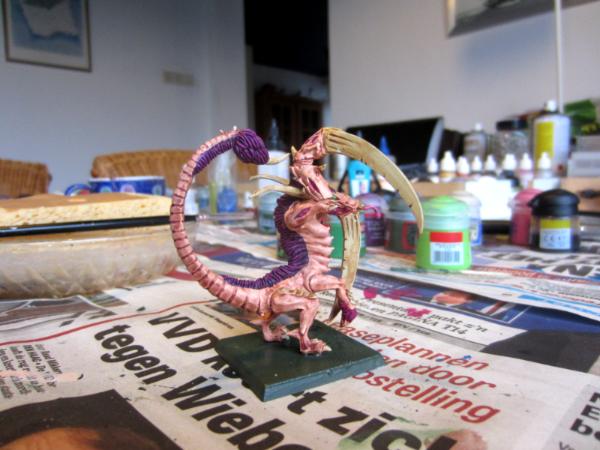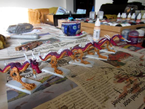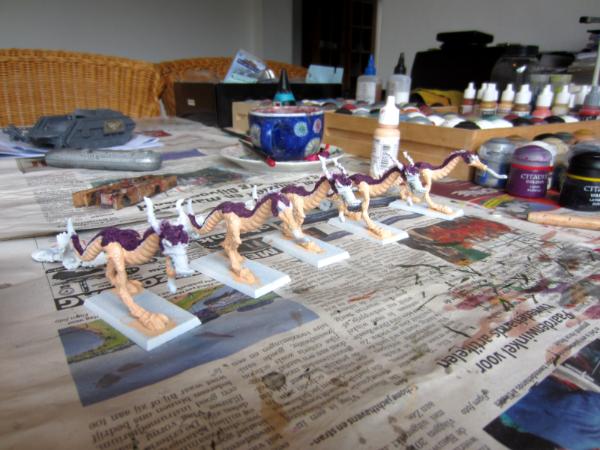 I start with dark purple on the backs, then wash it with more purple and then lightly drybrush pink and white over it, to create a mottled effect.