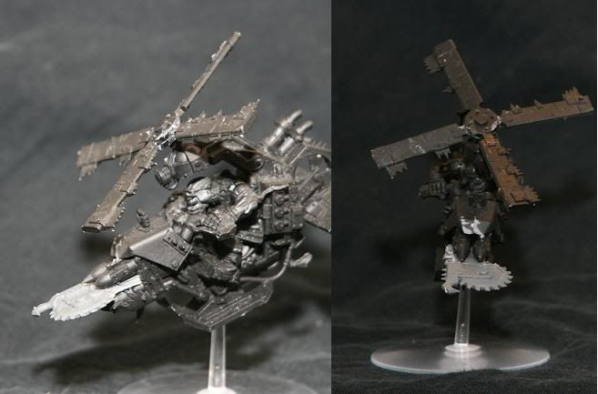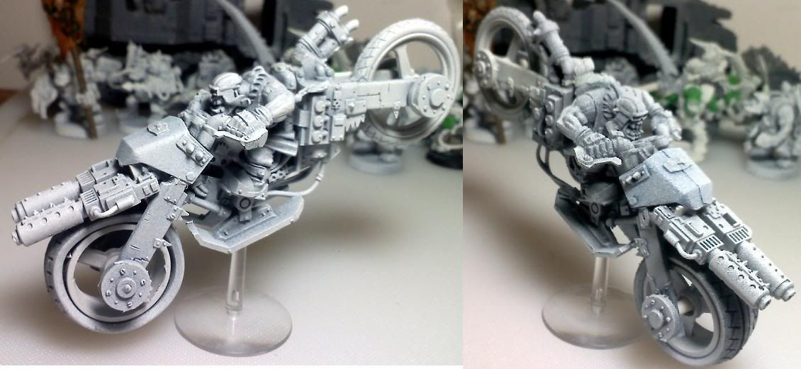 I really like converting Deffkoptas into Warbikes since they're so cheap and everywhere thanks to AoBR and real Warbikes are expensive. This one took me the better part of the day and a trip to the dollar store, but I'm really proud of how it came out. It's also posed dynamically.