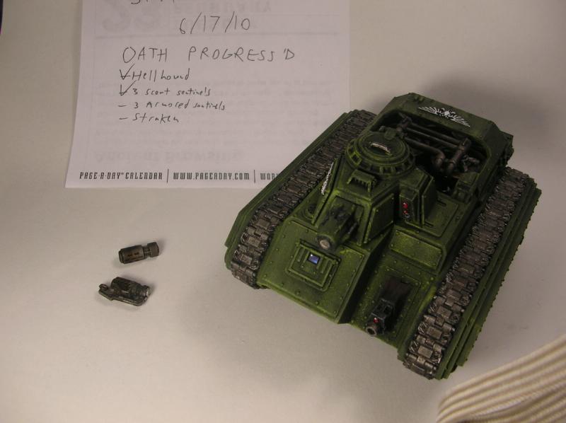 So, I painted up a Hellhound! Unfortunately, the spray primer came out really fuzzy at first. I tried scrubbing it off, and it worked in a lot of places, but it left a really rough texture over the whole thing. Fortunately it's not too bad though. Anyway, here's my Hellhound with a magnetized gun barrel: