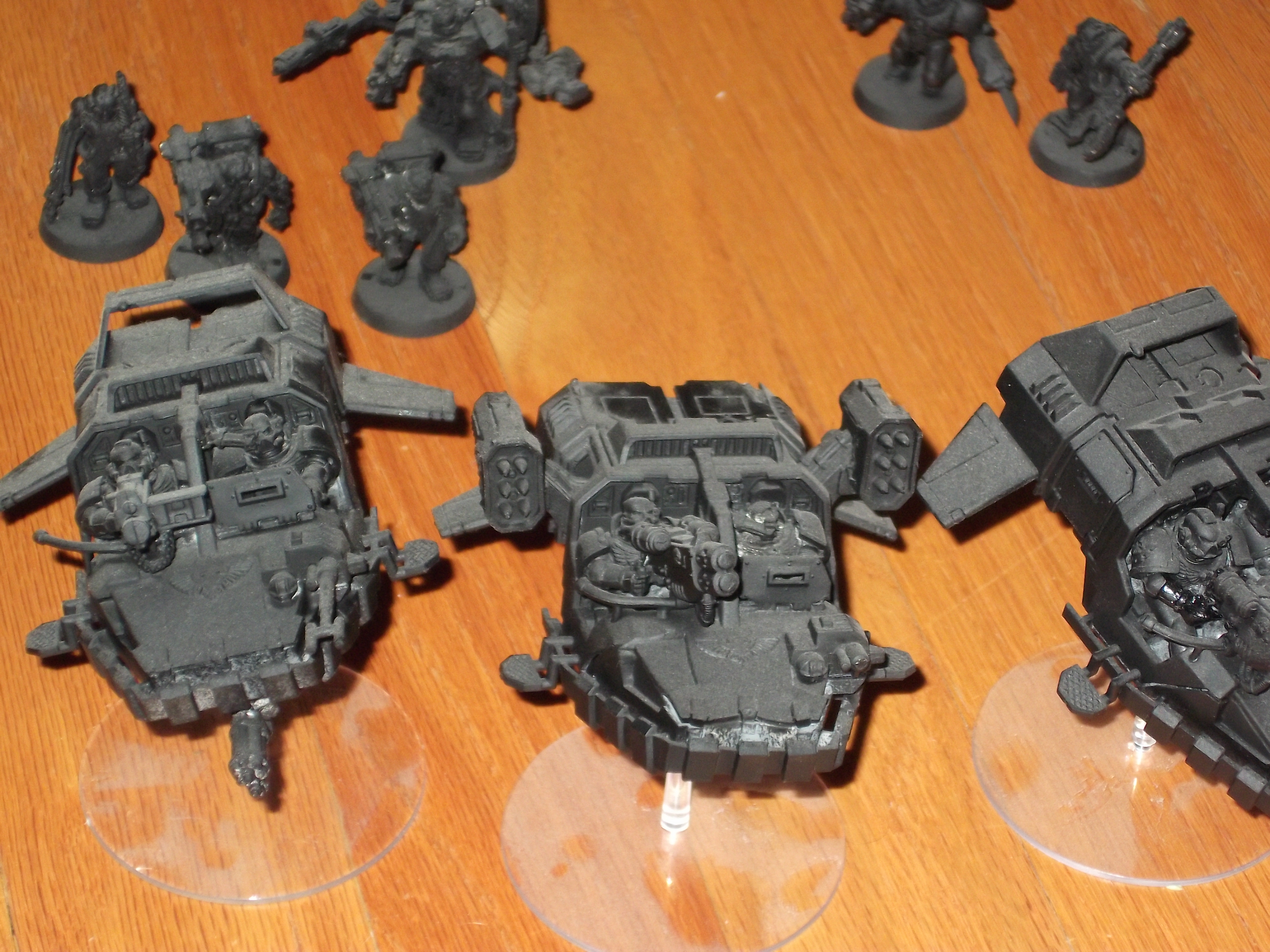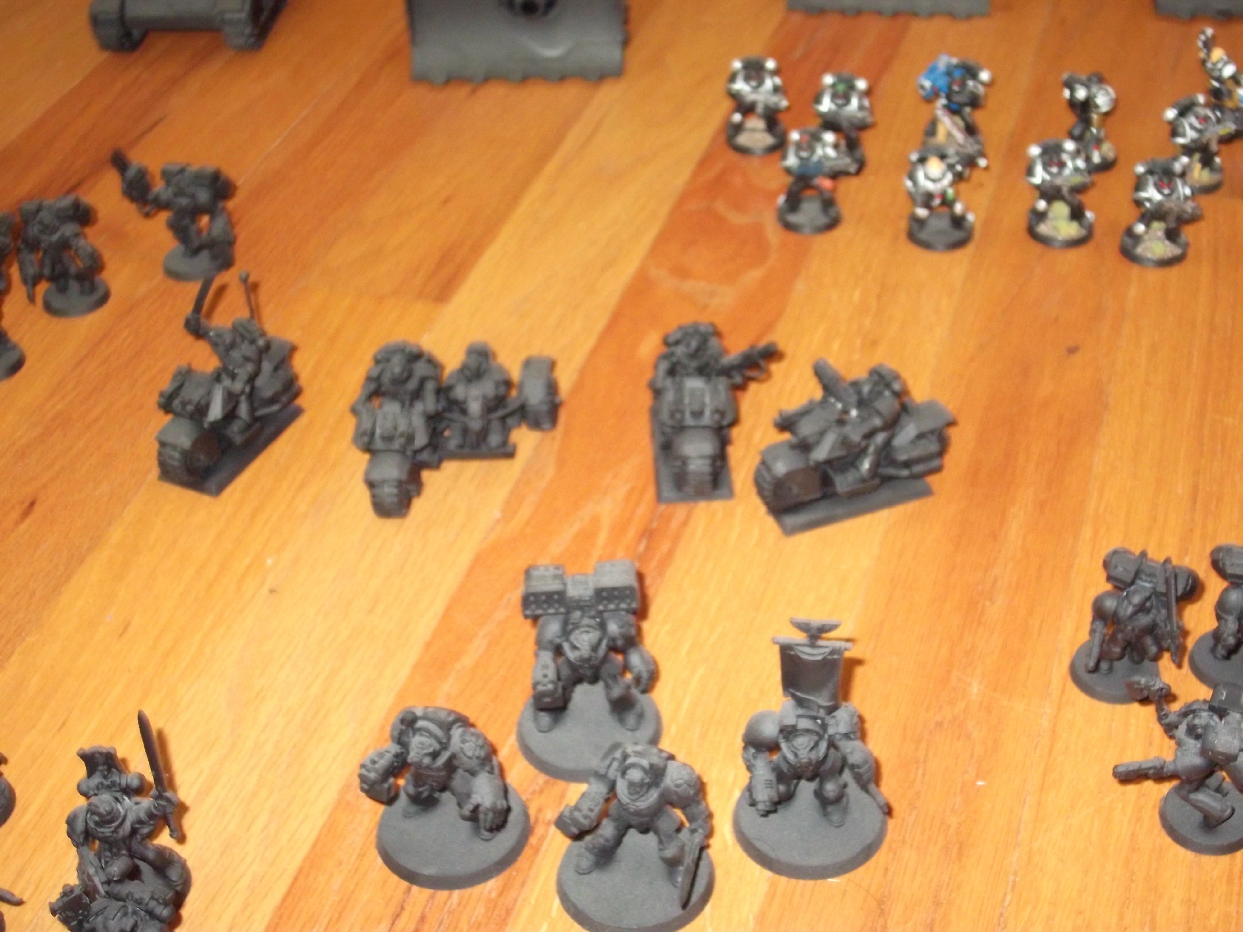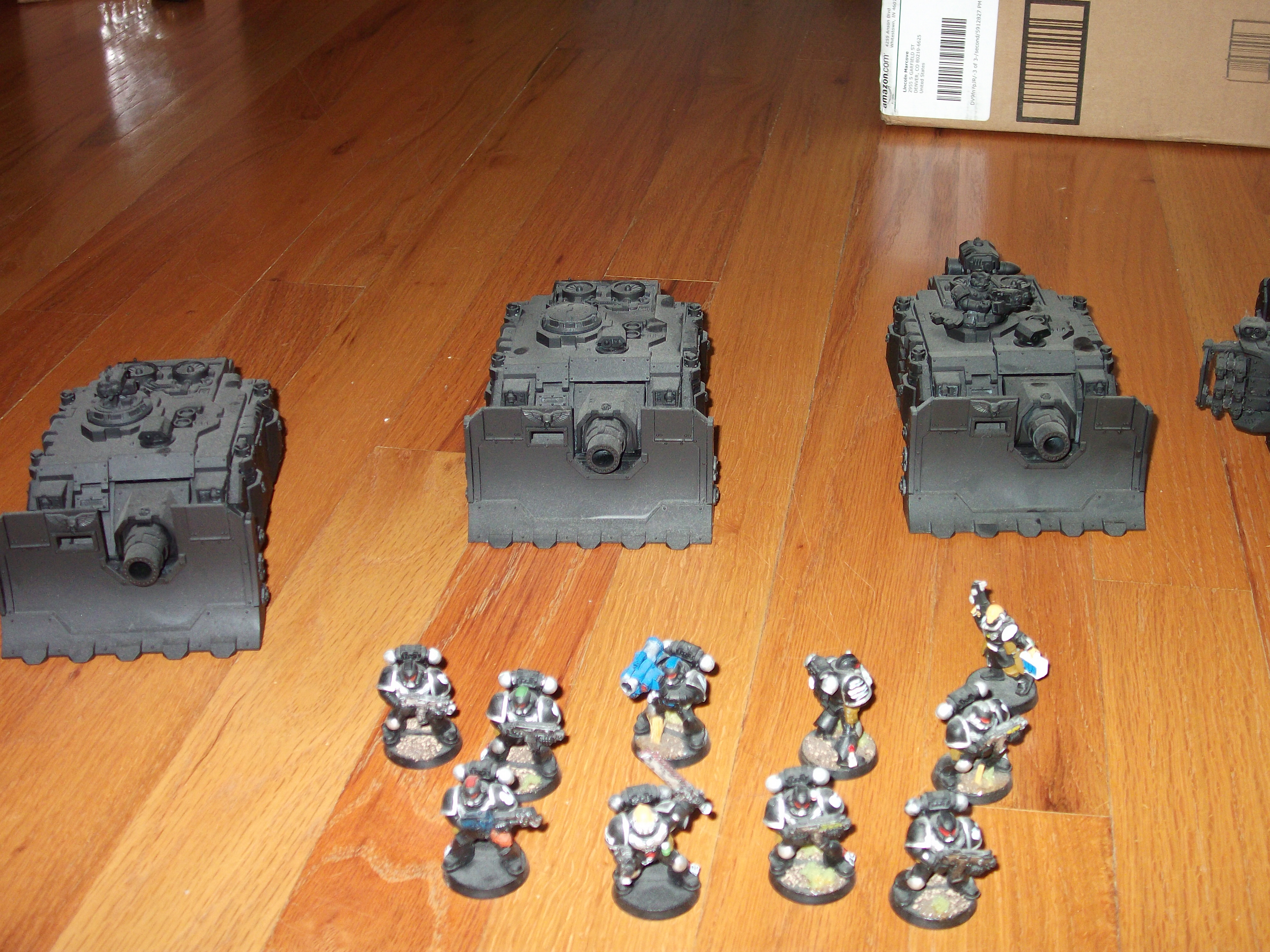 UPDATE! SOME MODELS HAVE BEEN SOLD/ON RESERVE AND I'M NOW OPEN TO TRADES! I have around a 5000 point Space Marine army that I HAVE to get rid of. The set includes: Available Again: 4 Land Raiders, 2 are normal, 1 is a crusader, and 1 is a Terminus (Comes with rule sheet). GONE: 3 VINDICATORS (previously said Demolishers) PENDING??:3 Land speeders, all different variants (one of them was sort of fragged by a blow dryer) ANTI-VEHICLE GONE:2 dreadnoughts, one is anti-infantry and the other is anti-vehicle GONE: 10 assault terminators 5 command squad terminators with various upgrades 1 terminator Chaplain 1 Captain with command squad (Chapter banner, Emperor's champion, Apothecary) 1 Librarian SHRIKE GONE: 1 Shrike, including Shrike's wing GONE1 Razorback with lascannon GONE:1 Predator with anti-infantry set-up GONE:4 bikes which includes one attack bike SNIPERS GONE: 10 scouts, 5 of which are snipers Available Again: 1 Techmarine with servitors GONE: 5 assault Marines 10 GONE20 tactical marines with various upgrades 1 devastator squad with 1 of each of the heavy weapons, poorly glued. Easy to break apart and redo More specific details will be added upon request All of them are primed and ready to paint, some already have been painted with Raven Guard colors. I won't be too sad if you paint over it I love WH40K, but I need to sell this before I ship out so $100 takes ALL that's left... willing to haggle if necessary Thanks for looking!!!!! UPDATE! Now open to trades for Chaos... yes it seems I am a traitor :( interested in some heavy support/troops/HQ