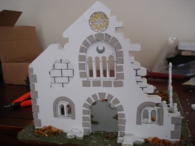 Alright, I took what suggestions I felt I could implement without tearing the thing apart. I decided the building is built of some sort of light clad material over brick, so I stripped a layer of the card in areas and used the pencil method to carve in bricks. I then weathered all the corners with a pair of clippers - you're right, it looks better that way - and added a stained glass window. The double layered card look was fixed with some glue and masking tape - once it's painted, I think the layers will be invisible. Next time I'll try and work on the lego look some more - oh, and add a roof.