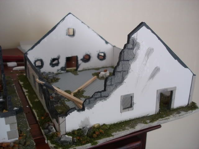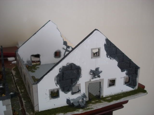 The front looks great, one of the things that is really hurting it is the top double layer of foam. To cover it up on the less wrecked half you could build a little bit of a destroyed roof. for the wrecked half you will either have to cover it with thin card or construction paper or change the full way you have shown damage.