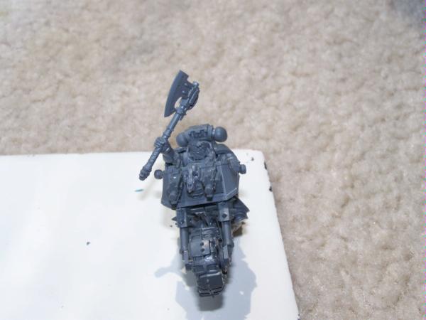 There were a few difficult parts of this conversion. Most of it was pretty straight forward but it was hard to get the SM legs on the Ork bike. They just weren't meant to fit and are to narrow. I accidentally broke them while I tried to cut them and get them to flex. The other hard part was getting the right distance between the handle bars and his arm. They bars just don't want to sit on the part of the bike where it would fit well. I had to play with it a lot. I slapped some wolf bits on that I liked. I'm wondering if they are to much. Also, I didn't include the exhaust pipes from the ork kit.