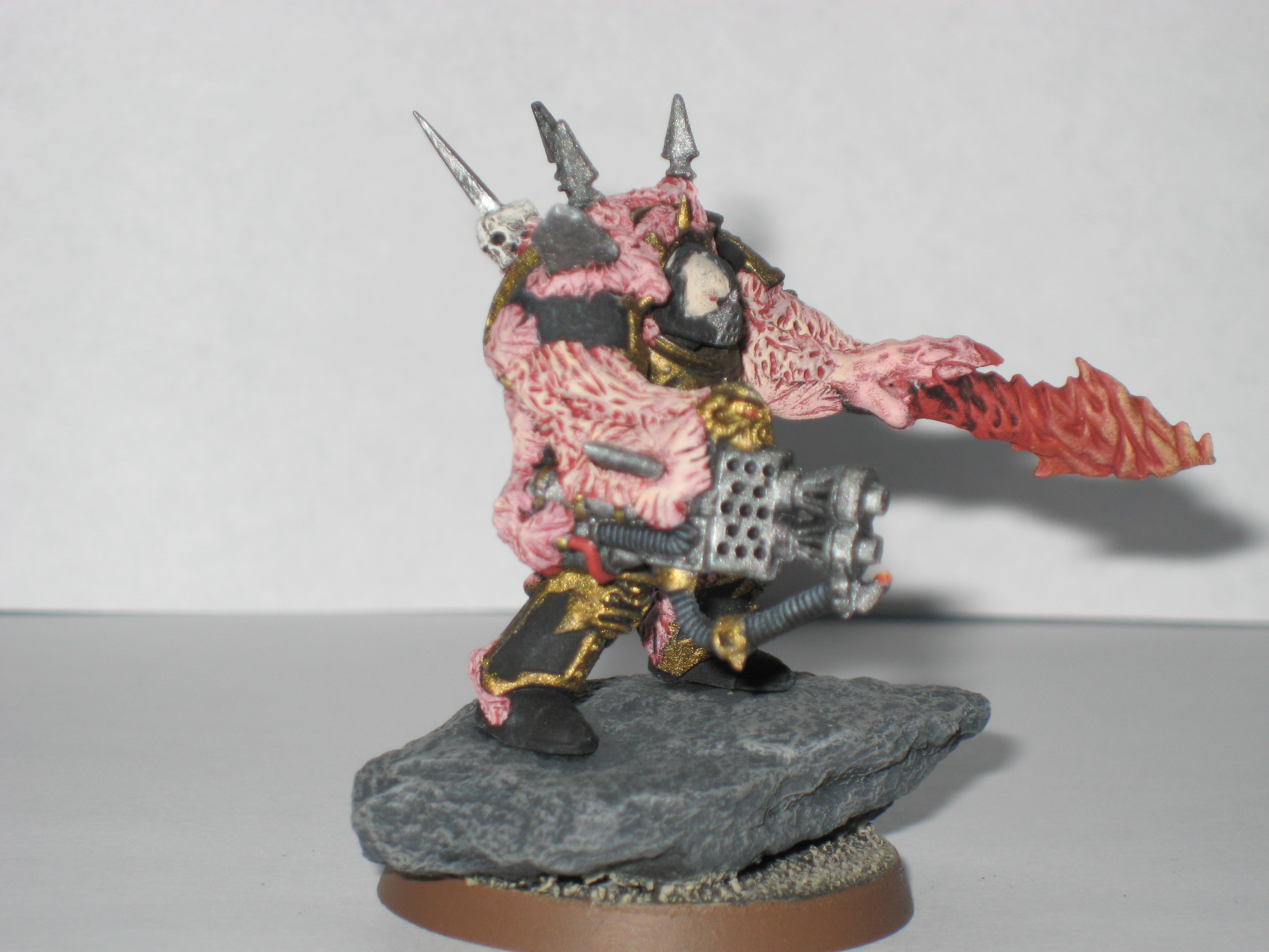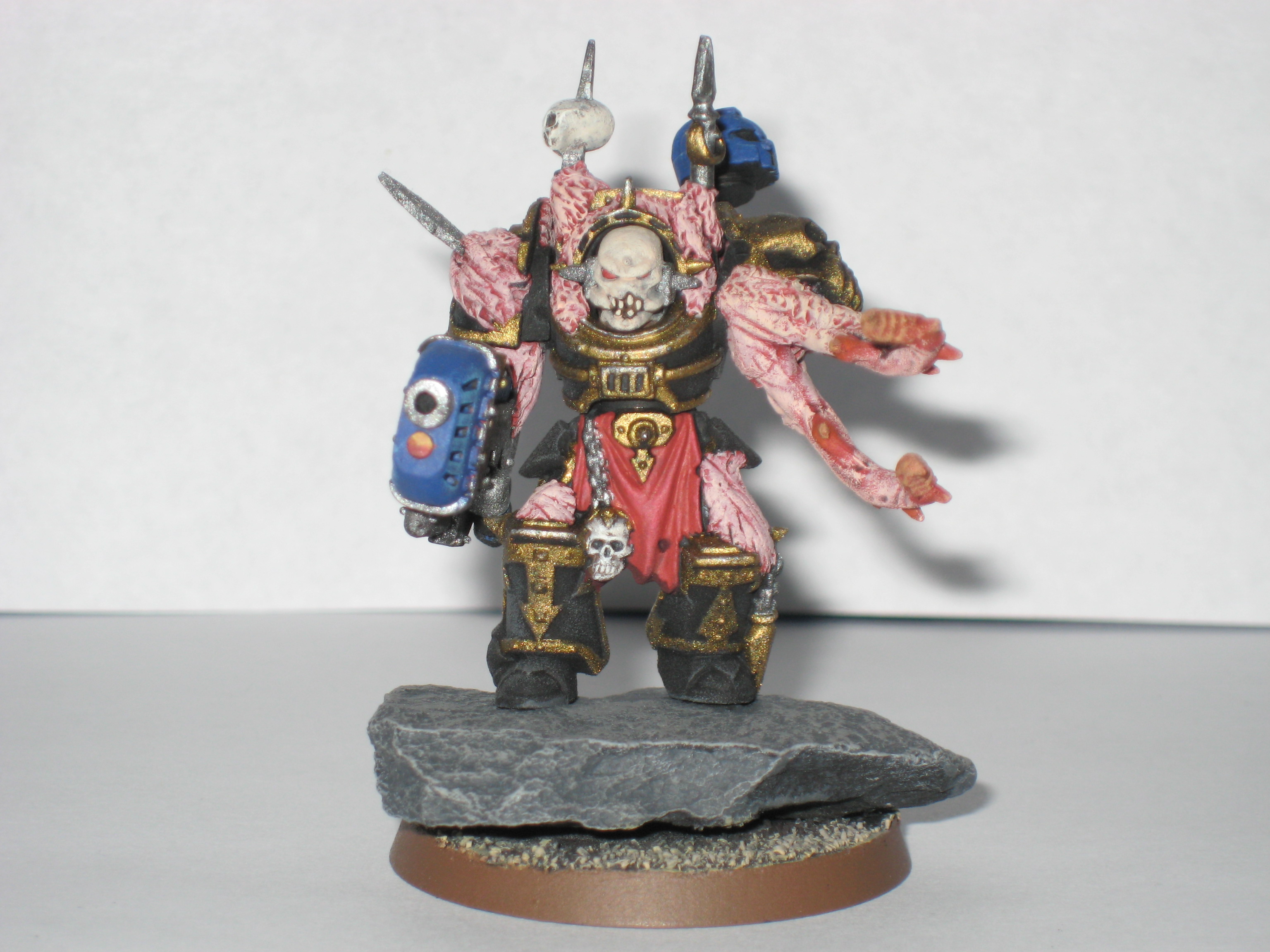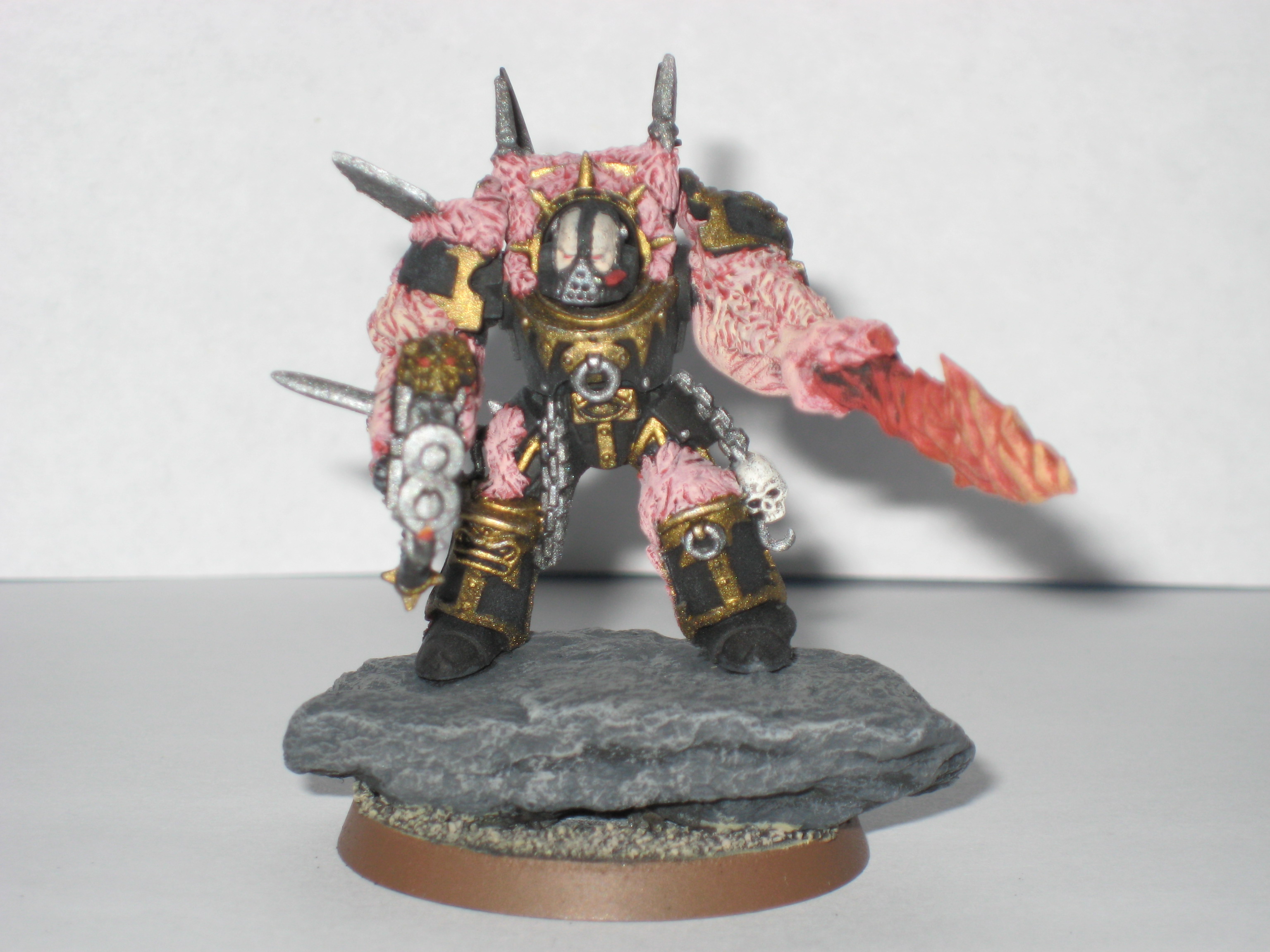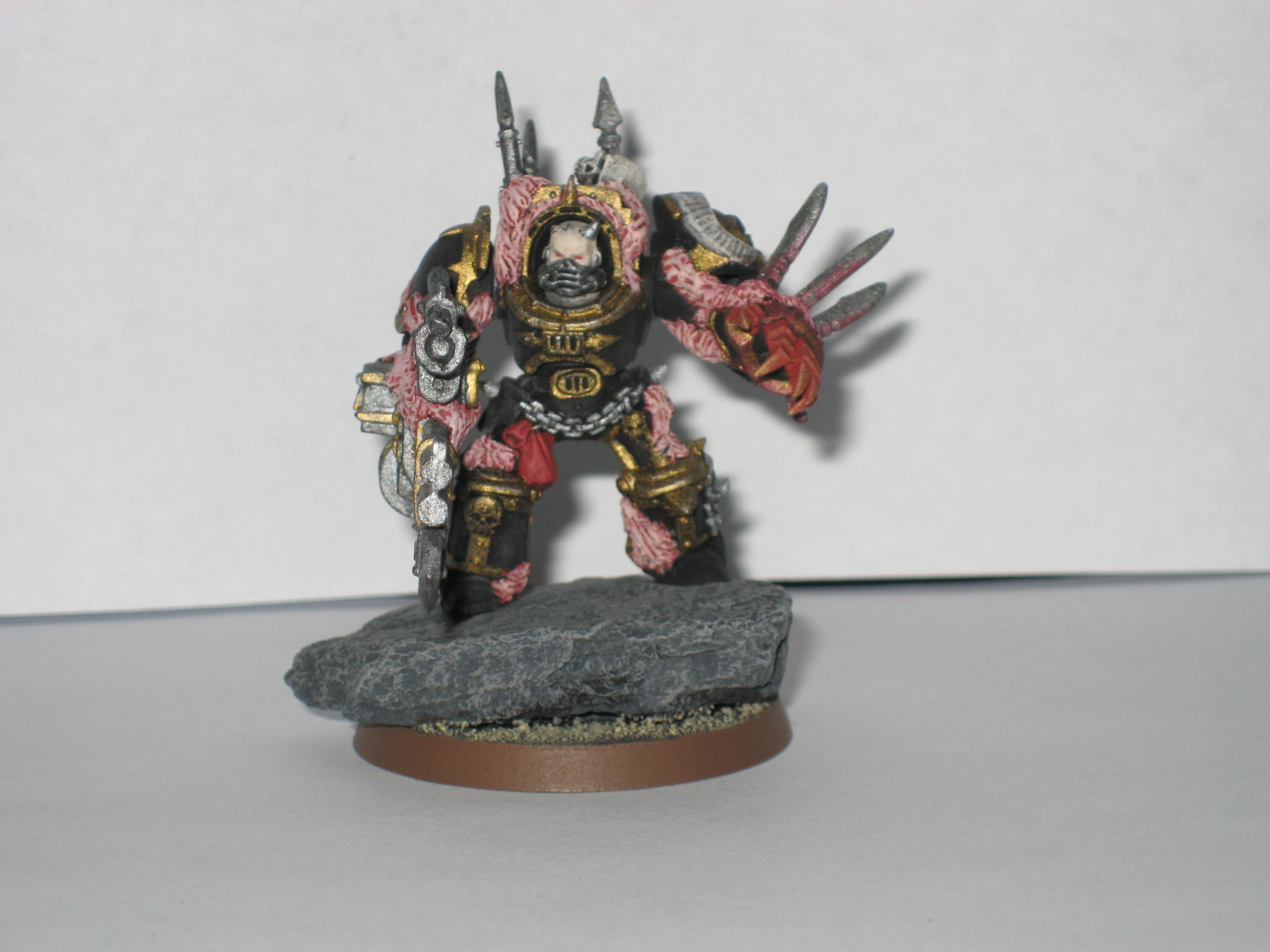 Adanis wrote:They're about half an inch taller than chaos terminators(including terminator spikes), but with a little bit more bulk. I added in the cliffy/rocky outcropping to add some of that mass to them, and to give them a mobile cover save.
