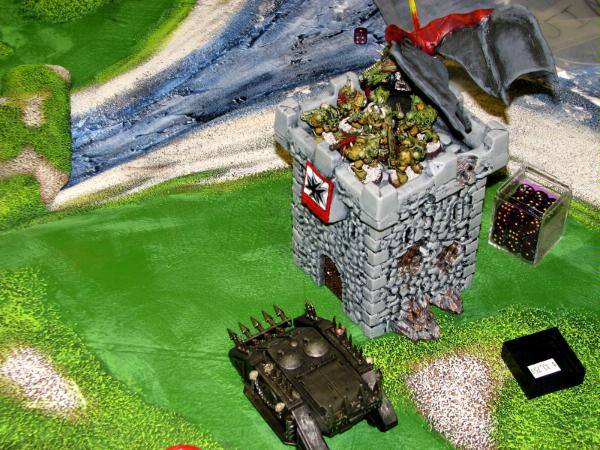I move my Plagues and Prince into the tower and continue to dither over the Berzerkers (now rhino-less) and whether to use them as a guard or an assault unit. I get a weak lash (5") and group up his Loota squads before sending over Defiler Love. The Lootas lose another 4 or 5 goons. The other Defiler shot goes into the nobs that come my way. I believe they took 2 casualties from the blast. I begin to move up my plagues (still in a rhino) and berzerkers to meet the Ork Mob.