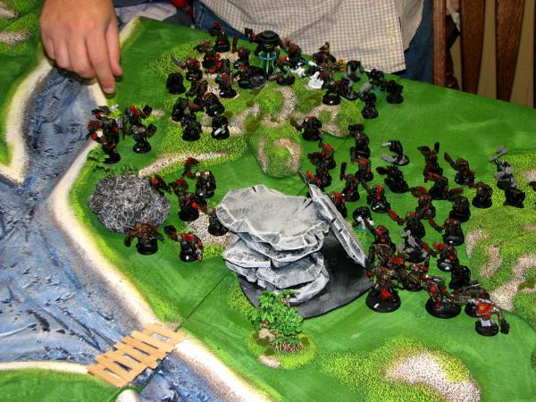 A lot of the game hinged on my two defilers throwing out a massive amount of damage. Turn 3 the Orks had the option for a "ere we go" (Deepstrike). They may have been better off had they taken it over to my Defiler area and started harassing them. They may have also been better off had they warped onto my objective. The problem in both cases though was that the squad was simply too large to make a deepstrike a very sure thing. Even when it was whittled down to 15-18 orks, that's a lot of models to fill. My Rhinos left a lot of craters in my backfield and there just was no good area to drop down at. He also failed to deploy anything that could really have been dangerous into that area (He really should have guessed I was going to try and make that cliff a firebase, although maybe he was thinking I wanted more armor near my objective). This makes me appreciate the power of reserves.