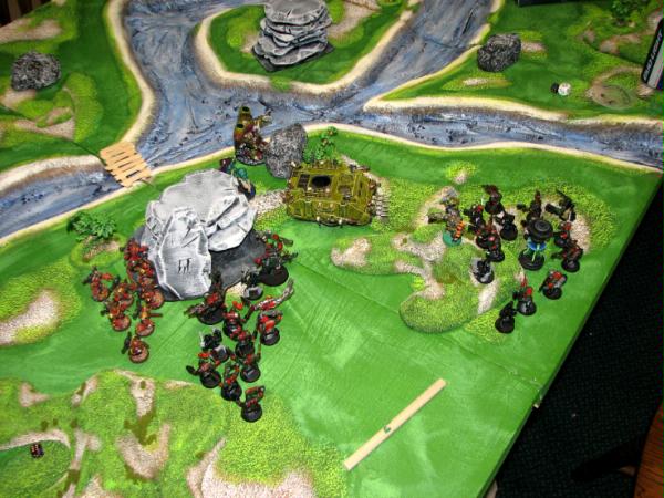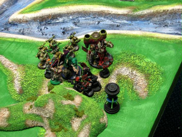 DP moving towards his objective. He decides to go defensive and moves to reinforce his objective. Very little damage is done this turn by the Orks, although some Lootas must have popped a plague or two.