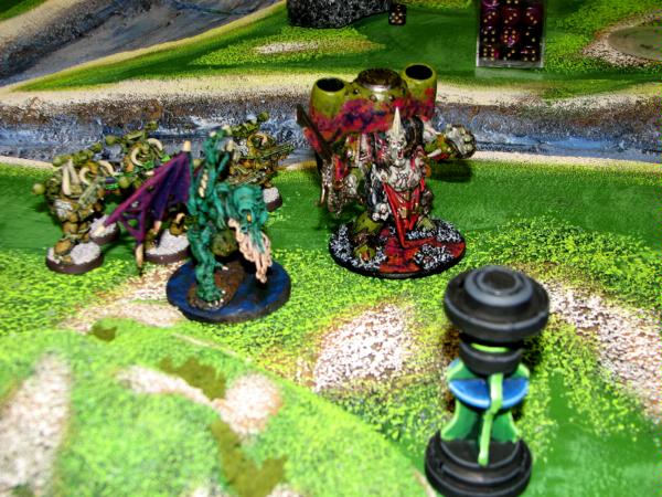 Lootas decide that being lashed is no fun and proceed to blast my Demon Prince into a fine paste. The very weak loota squad also puts some shots into my plague marines, causing 1 casualty. I'm starting to think the tower was a terrible idea. Nobs move closer to my Defilers but are slowed by the river. Zog's group moves as well, but is just out of range of an assault.