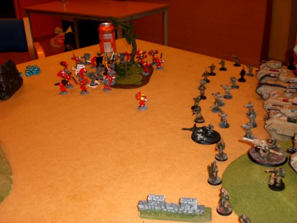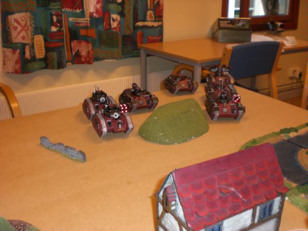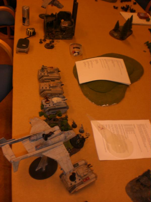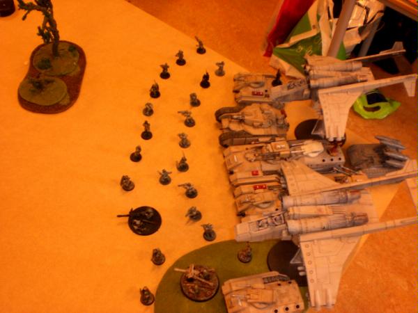 In return, I set up my entire army in the opposite corner, far away from the objective in my zone. My infantry squads go into reserve, and my sentinel outflanks. The vendettas scoutmove towards his table-egde, ready to take on the side-armour of his wagons. The vets and PCS are on my other flank, ready to move towards my closest objective if needed. With this set-up, my opponent has to make a difficult desision. He either has to charge straight into my line, and away from the objective in my zone, or he can go for the objective, but have to take all my firepower for the rest of the game.