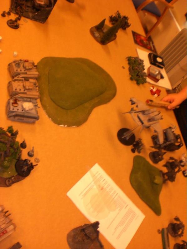 He wins the roll-off and takes first turn, denying me the quarter with a nice little wood in it. (over here, woods give 5+ cover to vehicles in or behind it, regardless of actual obscured status - makes them useful again). He states that his entire army will deepstrike. In hindsight, I think he should have given me first turn if he was planning to deepstrike anyways. Yes, I would have gotten a coversave on some vehicles, but would loose two rounds of shooting instead of one, and I wouldn't know for sure if he was going to deepstrike everything or not, and as such, I would have to consider both a normal set-up and an anti-deepstrike set-up. As he took first turn however, it made my set-up easy.