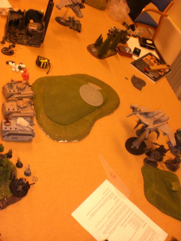 He rolls in, and chooses to split his force in two halves. 4x chimera + vendetta on my left flank, rest of his army on my right flank. This is just fine with me, I decide to try to stop his left flank attack, securing me the left objective, and giving me the egde in the middle. I'm also glad that he didn't outflank his vendetta. There is very little chance that it will survive my next turn.