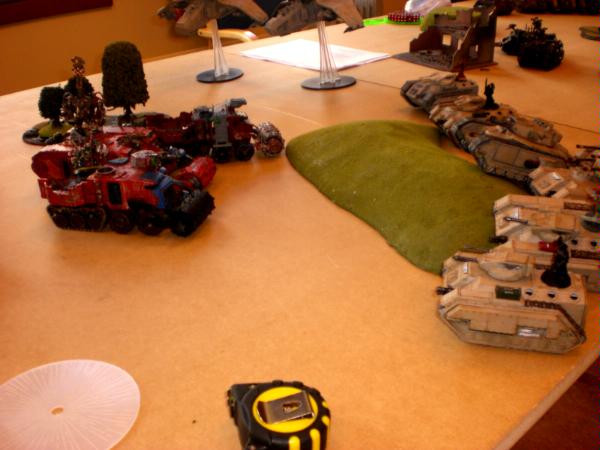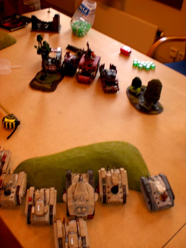 - My opponent's deployment. Battlewagon with nobs, mek and warboss in the middle, trukks on each flank and kanz spread out between.