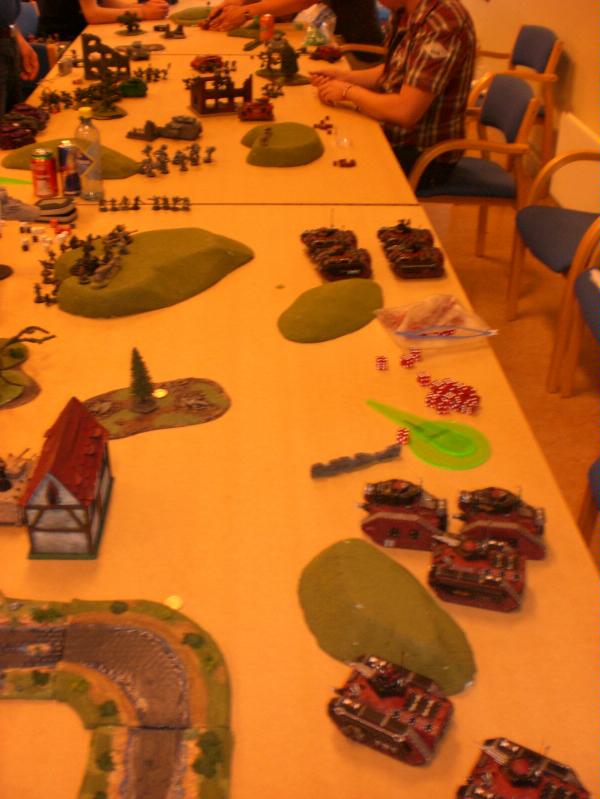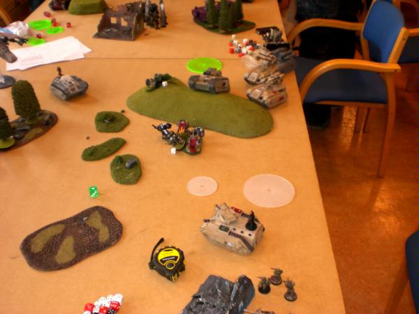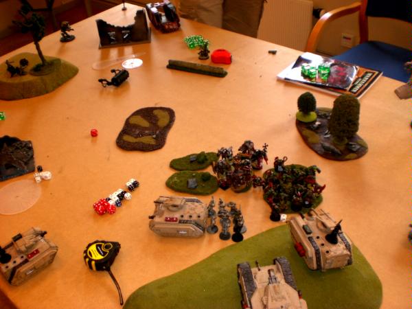 My CCS starts, getting a BiD order off and getting three hits. The first one fails, but the other two goes through and it is blown up. Then the rest of my army opens up on the chimera, and it blows up too. The remaining firepower is spent on the manticore, and it bites the dust. He now has nothing that can contest the objective in turn 5, and as long as the PCS survives, I have much more firepower left than him, and I should be able to keep him off it in the later rounds too.