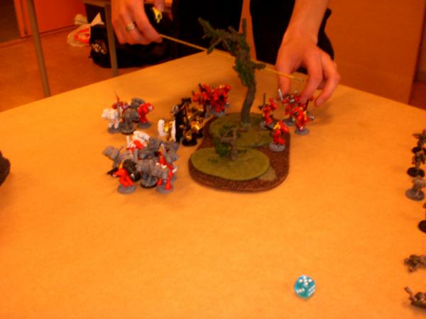 I have to reduce his power quickly, or else he will quickly overrun my position and start racking up the KP's. Sadly, only one of the squads that has arrived isn't fearless, and sadly, it's not the one with the priest. I decide that it is better to make that squad run away, and live with his FNP for another turn, than trying to take out the squad with the priest. Besides, if I take out the priest now, he will just drop the next one down the next turn, and have FNP again.