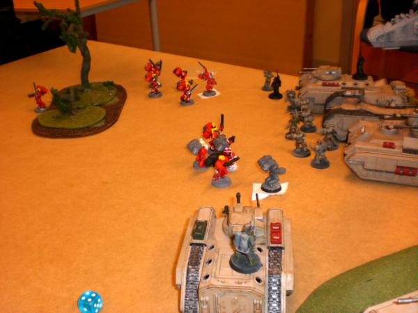 After the shootingfase, Dante and his guard are gone. The squad I tried to WR last turn is taken down to a single guy. My PCS get about 9-10x4 hits on the newly arrived squad, and 5 assault marines bite the dust. This time, weaken resolve goes off without a hitch, and the marines fall back. (and are witin 6" of my PCS chimera) The score is now 2-2