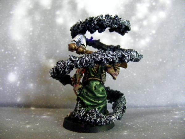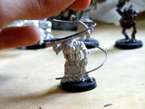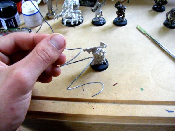 I decided it would ratehr apt to make this herald the one with the cloud of flies upgrade and I was determined to show this on the model. The description says that they are completely shrouded in flies but i didn't want to cover up this model as its so damn awesome. I contemplated painting the flies all over his body, but decided that would look wierd. Another idea was converting some kind of cloak to look like he was being followed by a swarm of flies. I eventually came up with the idea to do it in a spiral. This way they would be all around the figure but wouldn't obsure the model. This is how i did it: