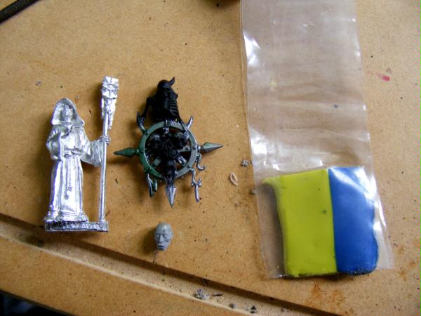 In the army list this is the herald that has the chaos icon so i set about deciding how to show this on the model. These are the pieces i scrounged up from my bitz box for the icon: