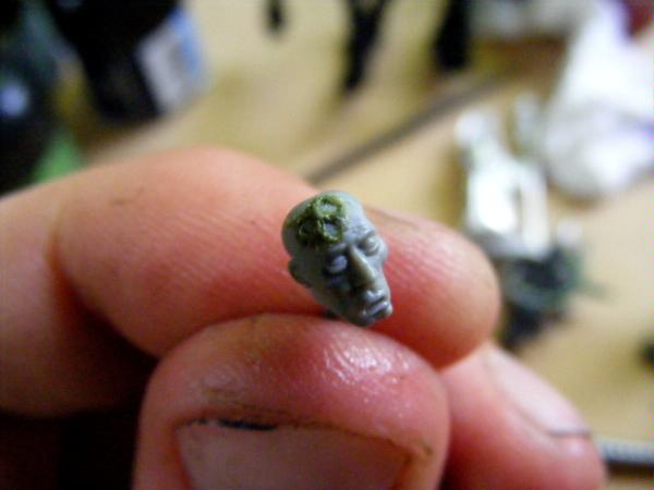Thats a severed head from the zombie sprue and the nurgle icon from chaos marine sprue. I started off altering the head first of all. I sculpted a few burst pustules on the severed head that formed the symbol of Nurgle.
