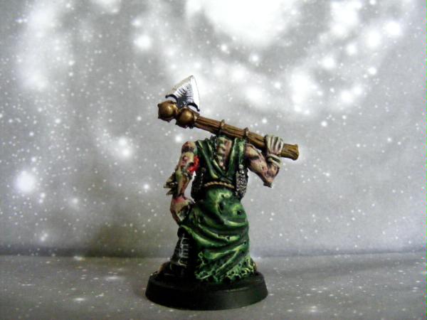 I then cut the back off and mounted it on the plate that held the eye before. I also sculpted the mark in place of the aquila on his belt. The staff has a couple of purity seals on it, instead of filing them off I added two additional wax seals in green stuff so that they too formed the symbol of Nurgle. A priest of nurgle must have their own form of purity seal after all. This is how the model stands at the moment.