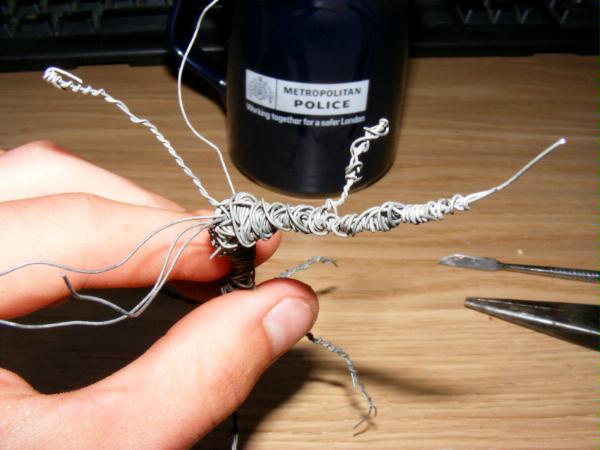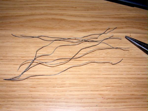 To start you need to first define the basic shape of the tree. I cut a 15cm piece of the complete wire and just unwound a portion at each end to give me the roots and branches. The same effect can be achieved by just winding together a bunch of strands. This stage also gives you a great oppertunity to play around with positioning of the branches and roots to best achieve the desired affect. 15cm lengths of wire and gives you a tree about 10cm tall when completed. Its easier to use you fingers to wind the wire at this stage.