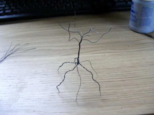 I then started on the roots. I wound lengths of wire from top to bottom making sure the top was thicker than the ends. Again I used my figures at the start and used the pliers nearer the end. As i added to the roots I found that i didn't have enough room for seven so I just wound a couple together to make more room. I ended up with five having started out with seven. When winding the wire start in a tight spiral that gets longer as you move away from the base of the tree. This ensures that you get the right shape on the root.