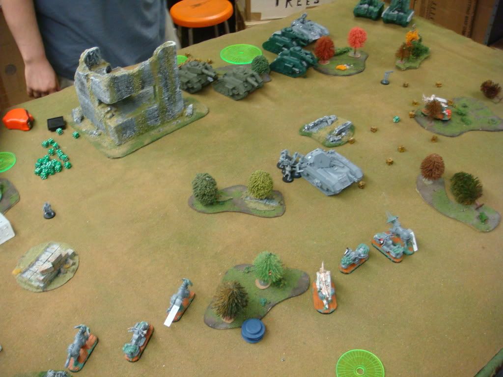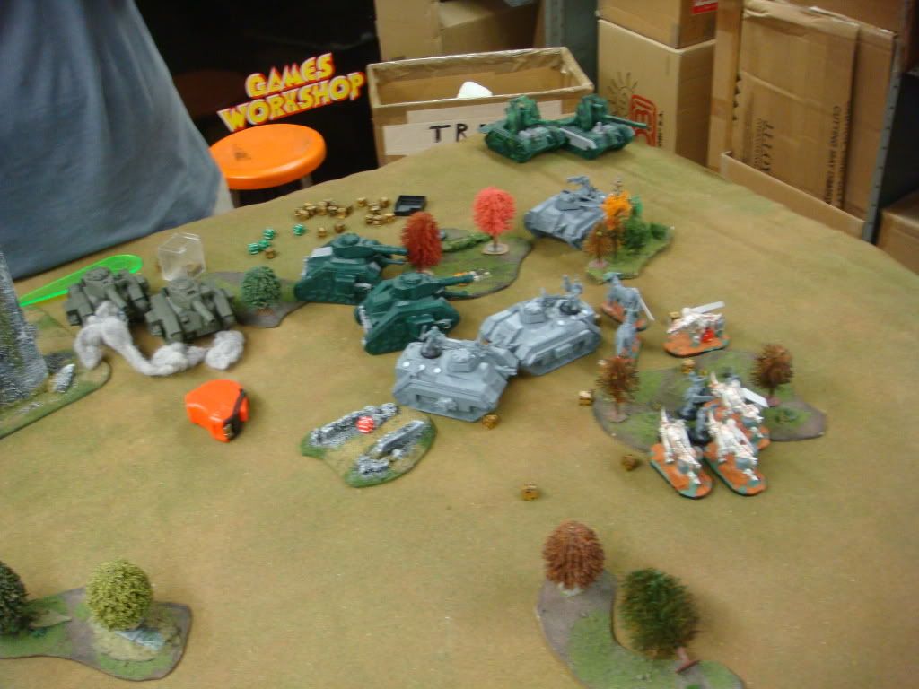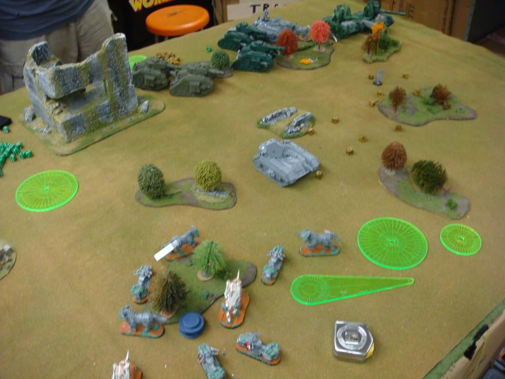 Basically… everything on his side opens up on the 5 man biker squad that boosted to his side. He killed all but 2… in a dice toss of awesomeness I made nine 3+ cover saves against all the plasma, lascannon, earthshaker, battlecannon shots going their way.