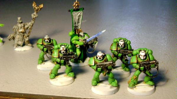 Marines tend to look a bit monotonous anyway, especially when you only get three(?) different poses to work with in the AoBR set. I think you've done an excellent job for a first time painter.....If you could see some of the horrors i came up with when i first started :S You've probably noticed how well the blue of the captains power sword contrasts with the green you've used as your primary colour. Why not try painting one of each marines kneepads the same colour? It would certainly help to break up the green Edit: Don't worry about painting too thinly  My SoB mini's have at least 7 layers of paint on their armour before i consider them done. Generally speaking, the thinner your paint, the better. Looking forward to your work in the future!