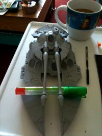 The next step after this was to make sure the side fins where glued to their mounts but not to the main body as this would aid in painting. Then once this was done, the model was sat together to make sure everything looked fine.